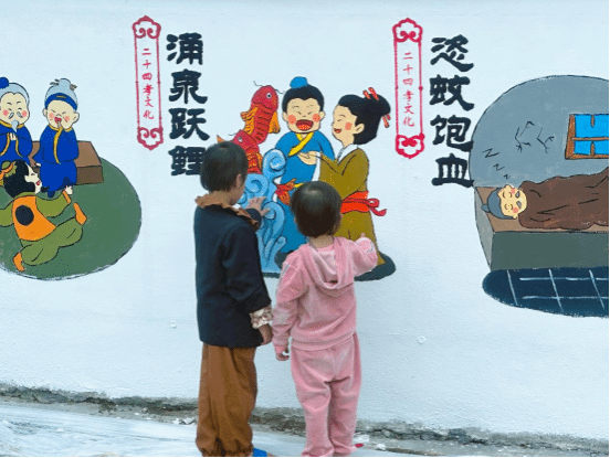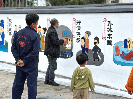 在接下来的两天,师生们齐心协力,勾、画、铺、调,共同努力将“二十四孝”图完成。在绘制过程中,成员们克服了时而炎炎烈日、时而细雨绵绵等困难,在户外调配颜色、绘图上色,每一次起笔抬笔都力求准确,做到“零失误”。实践团队成员许晴说道:“很荣幸能参与这次墙绘实践活动,能用手中的画笔,描绘孝道之美,我感到非常的骄傲和自豪。”不时有村民驻足观望点赞,感叹道:“怪好看的!大学生真是多才多艺,把我们的村庄建设如此之美!”