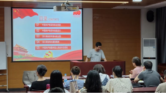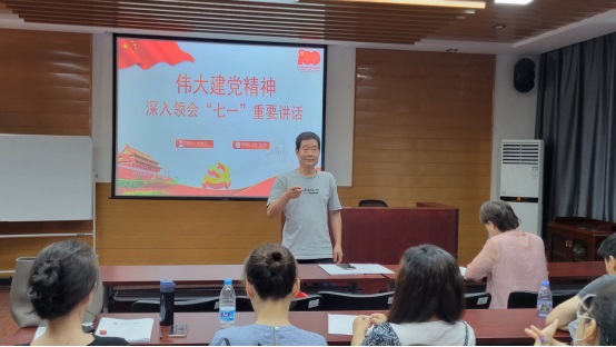 叶院长结合课件首先结合课件讲述了“七一”重要讲话的丰富内涵和精神实质:“七一”重要讲话是一篇马克思主义纲领性文献,是新时代中国共产党人不忘初心、牢记使命的政治宣言,是我们党团结带领人民以史为鉴、开创未来的行动指南。学习“七一”重要讲话精神,是当前理论武装工作的重中之重,也是党史学习教育的核心内容,对团结动员全党全国各族人民在以习近平同志为核心的党中央坚强领导下,满怀信心为全面建成社会主义现代化强国、实现中华民族伟大复兴的中国梦而奋斗具有重大的理论意义和现实意义。