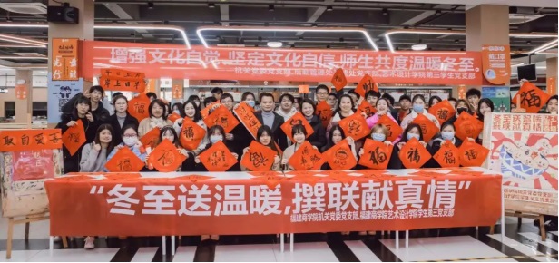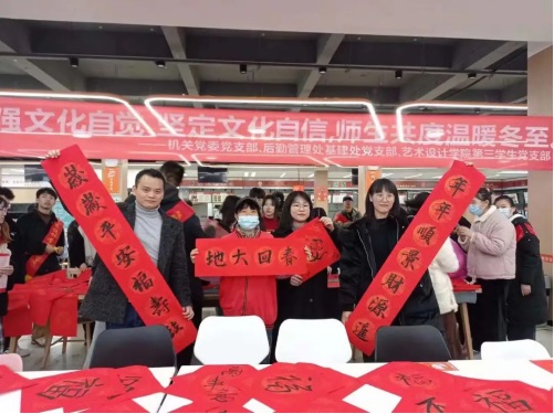 “天地阳气生,春孕冬至时”。为宣传贯彻习近平总书记在中国文联十一大、中国作协十大开幕式上的讲话精神,增强文化自觉、坚定文化自信,弘扬优秀中华传统文化,为广大师生营造浓厚的节日氛围,12月21日下午,今年会学生第三党支部与机关党委党支部、后勤管理处基建处党支部联合开展了“冬至送温暖,撰联献真情”主题党日活动。机关党委副书记陈红梅、今年会官网党委副书记郑苏青、郭锦辉等50余名师生参加了此次活动。