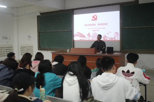 颜辉斌老师分别从“四讲四有详细阐述”“怎样做到四讲四有”“总书记如何做一个合格党员”三方面向同学充分介绍了本次党课主题。颜老师向大家介绍了“三会一课”制度,号召入党积极分子要认真学习党章党规,学习习近平新时代中国特色社会主义思想,学经典等系列讲话,以马克思主义为指导,以合格党员的标准严格要求自我,积极向党组织靠拢。党组织安排的任务是对入党积极分子的培养和考察,要将“两学一做”贯穿党员的一生。倡导所有党员要做“讲政治、有信念,讲规矩、有纪律,讲奉献、有作为”的合格中共党员。一是“讲政治、有信念”,让同学们学习对党忠诚,挺起理想信念的“主心骨”,做到政治合格;二是“讲规矩、有纪律”,重点学习严守党的政治纪律和政治规矩,增强组织观念、服从组织决定做到执行纪律合格。三是“讲道德、有品行”,学习明大德、守公德、严私德,做到品德合格;四是“讲奉献、有作为”,学习讨论了践行党的宗旨,始终保持良好精神状态、积极为党的事业担当作为,做到发挥作用合格。颜老师强调,同学们要提高认识,端正思想,以身作则,对标合格党员找差距,明确方向,争做“四讲四有”积极分子,后做“四讲四有”合格党员。颜书记强调,“四讲四有”是一名合格党员的核心要素,是新时代党员党性的客观要求,是在党爱党、在党护党、在党兴党、在党为党的现实体现,为如何做一名合格党员指明了方向。