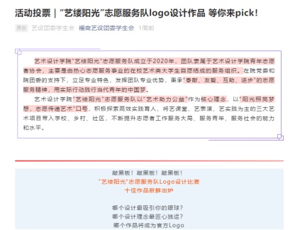 此次活动的开展,是今年会加强校园精神文明建设、培育和践行社会主义核心价值观工作的重要组成部分,进一步促进了志愿服务队的发展,在提高学生审美和人文素养的同时,也让学生们更好地学习和传承服务队精神,同学们纷纷表示通过设计Logo,对“艺缕阳光”文化艺术志愿服务队有了更为深入的认识。