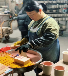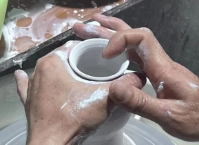 实践队成员深入德化与陶艺大师面对面交流学习,拜访了“薄胎”技艺大师——陈鹏程先生,与大师进行面对面的交流后,实践队成员充分感受到陶艺大师对传统陶艺文化的传承和坚守,了解到大师通过几年的反复试验,于烧制的陶瓷上还原了明代的“孩儿红”,是在原有瓷色的基础上加入一定配比的南红和朱砂进行调制。陈鹏程大师在现场展示了瓷器的“拉坯”流程,在展示过程中还为学生们讲解陶瓷的制作工艺,包括瓷土的选择、成型、雕刻、上釉和高温烧制等环节。在人生经历上,陈鹏程大师为我们阐述了他的人生经验,并总结出“生活艺术化,艺术生活化”的态度,以此激励着实践队员。