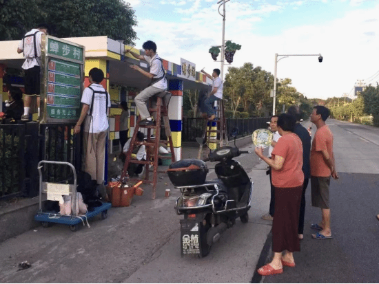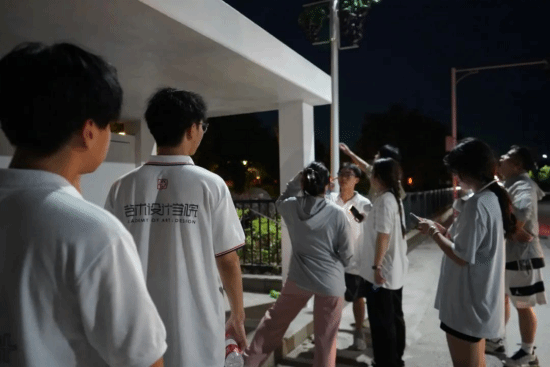 实践队对东岱镇蟾步公交车站进行改造,将艺术墙绘融入乡村基础设施,展现乡村新风貌。实践队通过对蟾步站周边的环境进行考察与多番探讨,以蒙德里安风格为基调,将蟾步村的田园河道特色抽象为几何艺术形态的绘画语言,同时融入东岱镇特色IP形象——“咚咚锵”,设计出既具时代感又不失乡土气息的墙绘作品。在高温酷暑下,团队成员不畏艰难。无论是烈日炎炎的白天,还是星光点点的夜晚,他们都坚守在公交站旁,用画笔和颜料为乡村增添色彩。他们的身影在柔和的灯光下拉长,与周围静谧的夜晚形成鲜明对比,绘就了一幅生动展现青春风采与乡村之美的画卷。