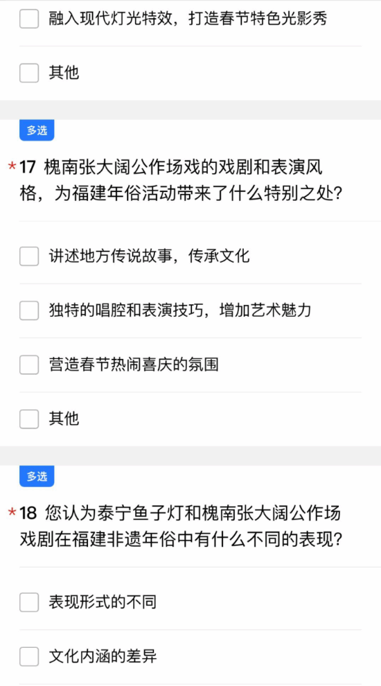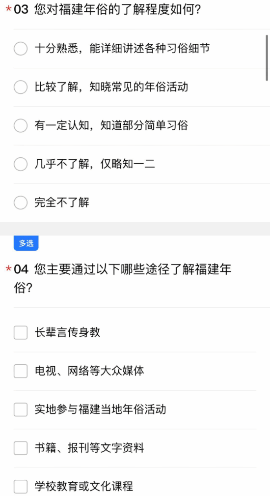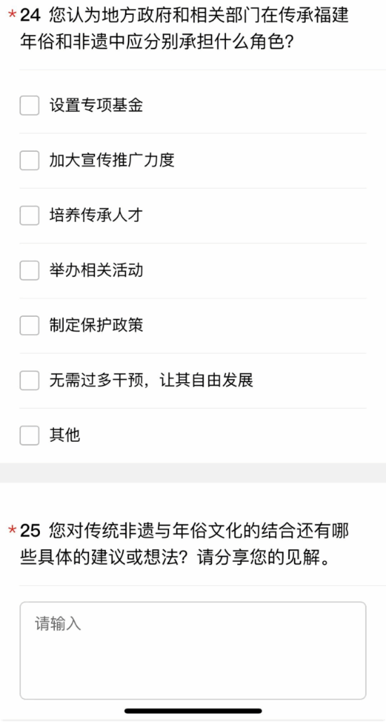 为了解不同地区与年俗有关的非遗文化现状,团队结合线下实践成果,设计并发布非遗年俗文化调查问卷,覆盖福建多个地区,收集有效问卷数据。通过文献研究、问卷分析及田野调查相结合的方式,系统梳理非遗技艺的历史脉络与现代价值,形成调研报告及实践成果集,为非遗保护提供参考。