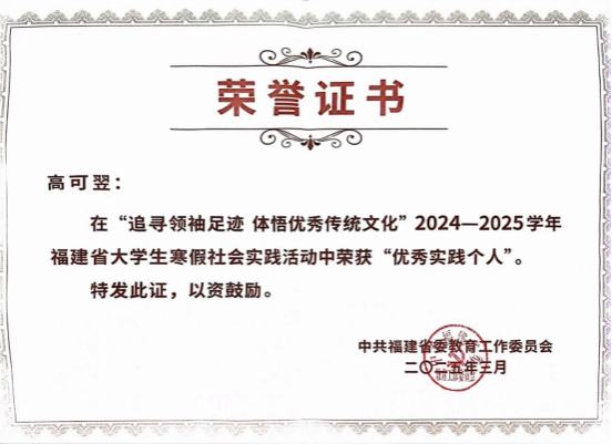 据悉,此次“追寻领袖足迹 体悟优秀传统文化”2024—2025 学年全省大学生寒假社会实践活动由中共福建省委教育工作委员会主办,旨在学习贯彻习近平文化思想,扛起“以文弘业、以文培元、以文立心、以文铸魂”的使命担当,总结好、宣传好、运用好 “追寻领袖足迹 体悟优秀传统文化” 主题社会实践成果,进一步彰显中华优秀传统文化的时代价值。经高校推荐、 专家评审、 网上公示等程序, 评选优秀组织奖 20 个、 优秀实践团队 75 个、 优秀实践个人 120 名、 优秀实践成果 105 项。