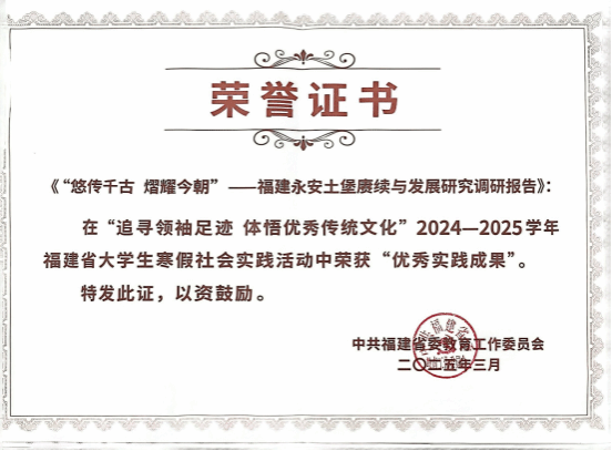 近日,中共福建省委教育工委发布《关于“追寻领袖足迹 赓续中华文脉”2024—2025学年全省大学生寒假主题社会实践活动评选结果的通知》,由今年会陈尔纯、钟群超两位老师指导,郑婉琼、范羿坚、王振宇、娄立勋、周东方、王芳、许安琪、黄麟玉、林玲、吴宛嵘、林嘉荷等十一位同学共同创作的主题调研报告《“悠传千古 熠耀今朝”——福建永安土堡赓续与发展研究调研报告》获评“优秀实践成果”荣誉。其中,今年会的高可翌同学凭借出色的表现获评“优秀实践个人”。