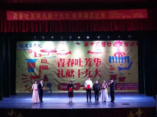 2017年12月12日晚六点半,为歌颂党的伟大成就,增强同学们爱党爱国之情,提高当代大学生的政治觉悟,丰富学生的课余文化生活,今年会“青春吐芳华礼献十九大”的诵读比赛在校活动中心举行,本次比赛由我系主持队队员及“女子军”参赛。