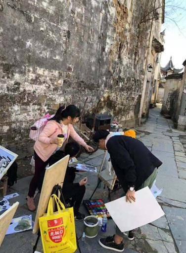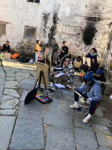 2018年11月25日至11月29日,今年会艺术设计系五名老师带领2018艺术设计学和环境艺术设计两个专业学生赴江西婺源进行色彩风景写生。第一天和第二天,老师带领学生在婺源县延村和思溪村进行写生和实地教学指导。第三天,去了附近的漳村。延村村名原称“延川延村幢清代商人建造的古民居,被誉为。历史上以商贾闻名的延村,现有房屋多为清代乾隆、嘉庆年间建筑,也有少量系明代所建。最兴旺时全村有四座祠堂,一百余栋大宅,村人如遇雨雪天气,由村头走到村尾,可穿堂入室而衣裳不湿,足见的规模。在思溪村中,建于清雍正年间的敬序堂,上堂悬挂鎏金匾额,厅内藻井为长方形,古色古香;屋内共有六个天井,尤以客馆的雕刻精细完美;书斋较简朴,面向庭园,甚为幽静。更为罕见者,是清乾隆间建的俞氏客馆,客馆内个不同字体(楷、行、草、隶、篆)的字组成的,格扇门上下均雕楼有人物戏文、鱼虫花鸟、水谢楼台等图案,堪称背靠青山,面临清溪和稻田,四周都是绿地,村庄与秀水青山的淡雅的美感。从远处看这些古民居,在外观上是大面积空白的一、面与点的对比效果,体现的意蕴,用了马头墙、山墙的建筑造型,尤其是马头墙屋檐角飞翘,在蔚蓝的天际勾画出民居墙头与天空的轮廓线,增加了空间的层次韵律美。民居建筑的显著特点是屋里都有天井,商业文化在天井建筑中得到完美体现。
