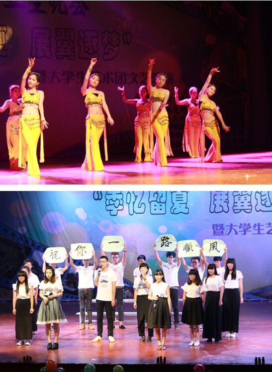 晚会还没开始,活动中心里面已人潮涌动,站着坐着的人填满整个礼堂。七点,晚会准时开始。别开生面的充满民族风的开场舞,不仅获得观众高涨的欢呼声和热烈的掌声,更是引得观众一阵欢呼,让礼堂更加热闹。接下来形式丰富,内容多样的节目,更是精彩纷呈,舞蹈,小品,唱歌,观众中不时爆发出阵阵掌声和欢呼声。中间的游戏环节,更是让整个场面更加欢快,台上台下的互动不仅拉近了两者的距离,更是将笑点引至高潮。游戏环节结束,老师给获得 “荣誉制罐杯”茶叶包装设计大赛的同学颁发奖品奖状。最拨动人心的是惟超学长代表大三学长学姐的那番毕业演说,让所有人都不禁心理潮湿,伤感突然而至。而皮影戏的节目,更是将全场的伤感情趣引至高潮,那些曾经美好欢快的记忆,变成生动的皮影戏,一幕幕出现在大家面前,而皮影戏的最后,离别的伤悲又激起大家心里的伤感。有些学长不禁潸然泪下。这次晚会,大家有哭有笑,有感动也有伤感。其实,不知不觉中,相信那些画面都已默默植入大家的心里。