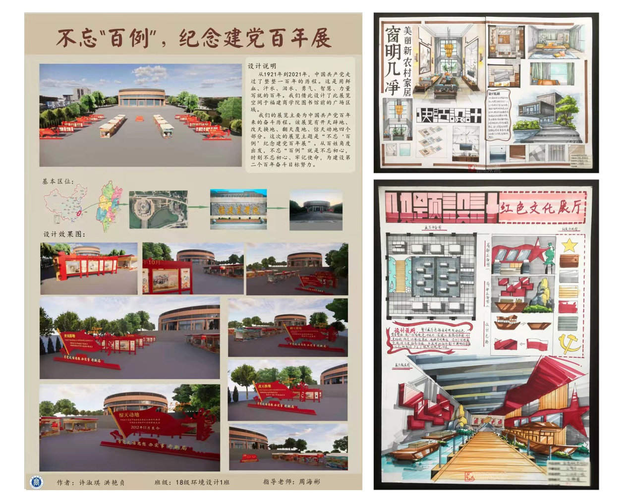 课程思政助力以文化人。深化教师对课程思政价值理念和实践途径的理解,在“基础素描”“空间设计”“民间工艺美术”等课堂教学中,将红色文化资源、中华传统优秀文化等引入课程设计,将课程内容与红色资源巧妙融合,推进主题性艺术创作活动,增强课堂教学的美育作用。结合建党100周年,组织“建党百年”想象素描主题课程创作、“美丽新农村家居设计”主题创作,党史百年宣传长廊设计、红色主题展示空间设计表现、建党100周年剪纸创作等,指导学生创作作品240多项,引导学生以弘扬主旋律为己任,为时代画像、为时代讴歌,在设计实践中扎根于时代,实现以美育人,以文化人。