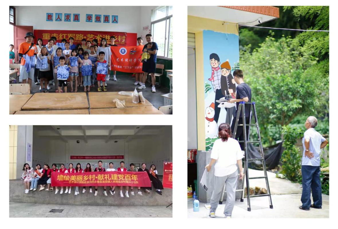 “设计下乡”助力乡村振兴。党支部教师党员组织带领学生立足专业,依托暑期社会实践,组织开展“设计下乡”系列活动,助力乡村振兴。与仙游县龙华镇金溪村党支部结成党建共建单位,开展艺术设计、绘画展览、乡村微景观改造等。2021年,党支部教师聚焦“乡村振兴”,结合专业特长组织带领学生开展暑期社会实践活动,引导学生在实践中受教育、长才干、作贡献。1支实践队伍被评为“全国优秀团队”;1名指导老师被评为“省级先进工作者”;1名学生被评为“省级先进个人”。