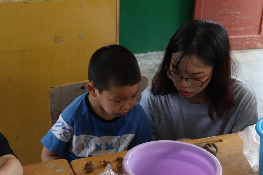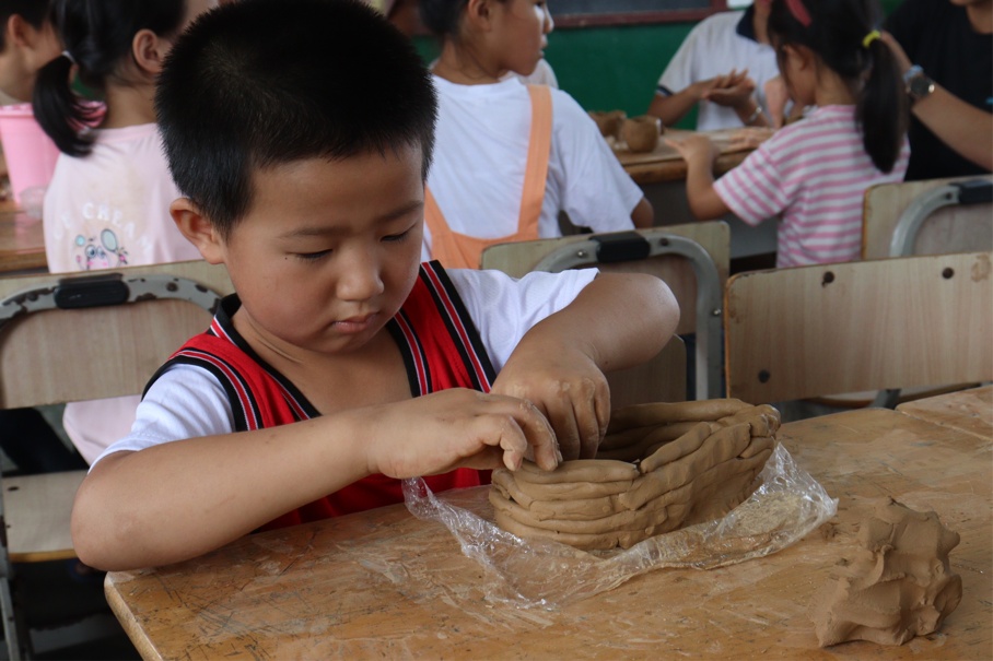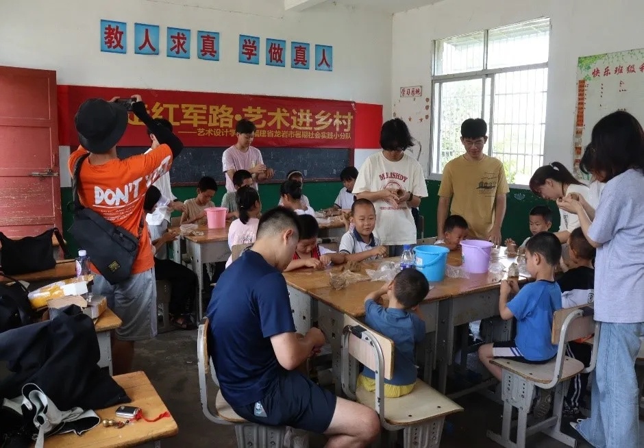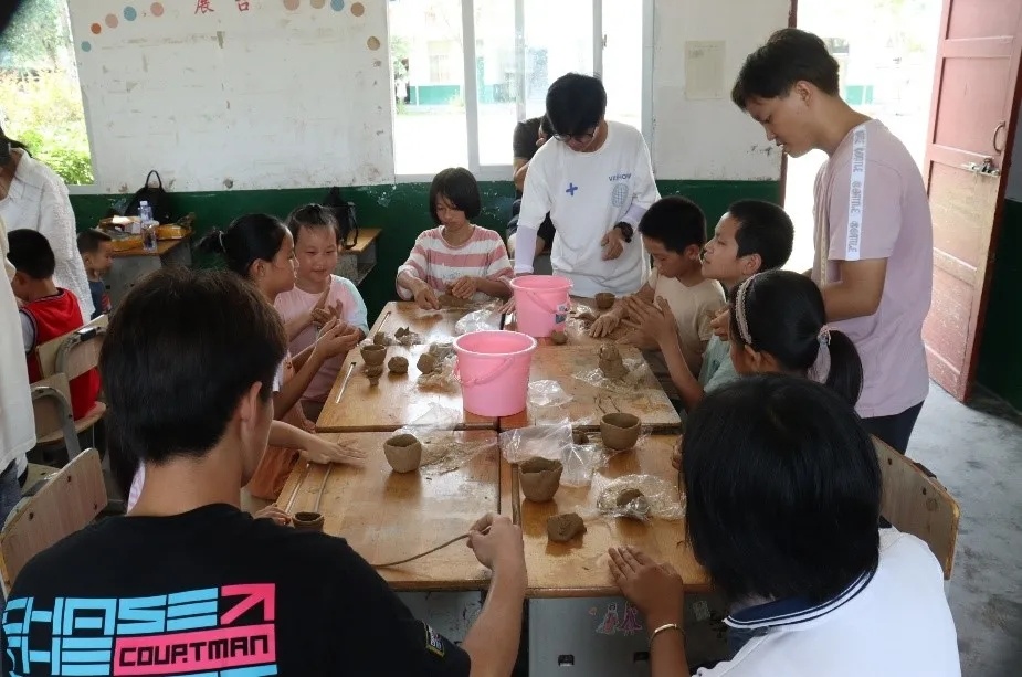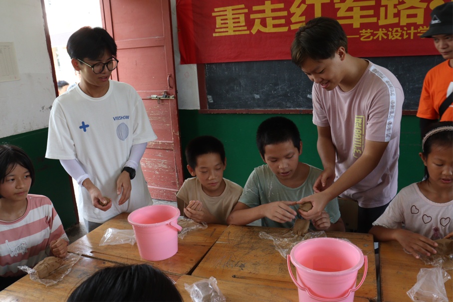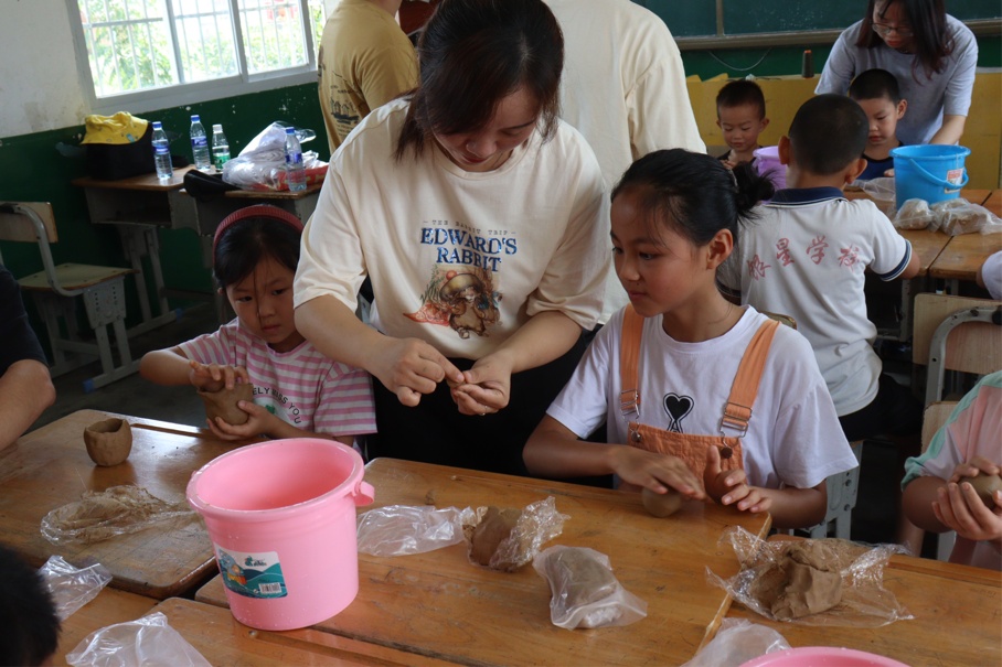 7月15日,实践队来到龙岩市长汀县新桥镇樟树村罗坑小学,实践队的老师和同学们带领罗坑小学的小朋友们进行陶艺认知和学习以及扎染了解和制作,并做出各种精美的工艺品赠送给罗坑小学的学生。