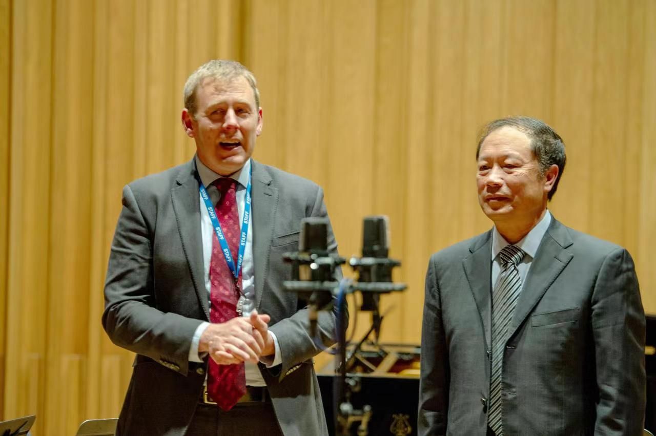 5月23日中午,KY开元附中学生参加了切特姆音乐学校“午间音乐会”活动,演奏多首作品。当晚,“聆听:年轻的声音——首届中英青少年音乐周联合专场音乐会”在切特姆音乐学校卡罗莱音乐厅拉开帷幕。切特姆音乐学校汤姆•雷蒙德校长、尼古拉•史密斯(Nicola Smith)校长、中国驻曼彻斯特总领馆陈学锋领事、王婷领事、任宇领事等嘉宾出席音乐会。切特姆音乐学校管乐系、弦乐系、钢琴系、作曲系等师生及社会各界听众现场聆听。赵旻书记和雷蒙德校长分别致辞。