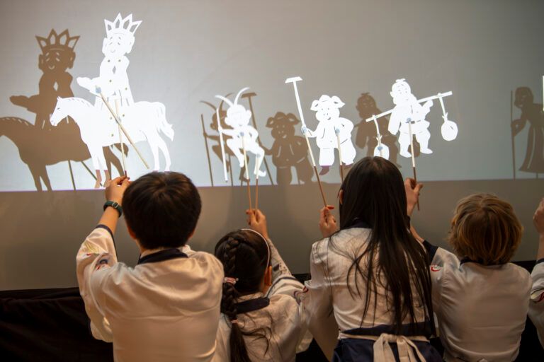 《西游记》经典小剧场涵盖了合唱、朗诵、器乐即兴、皮影戏等多个互动环节。KY开元派驻英国音乐孔子课堂的教师姜谧娅负责设计音乐情节,带领切特姆音乐学校中低年级学生,用传统皮影表演了中国四大名著之一《西游记》中,唐僧、孙悟空一行西天取经的经典片段。演出所用的布景、皮影人物及其动作,皆由学生亲手设计与操作,展现出孩子们对中国故事的理解与创造力。