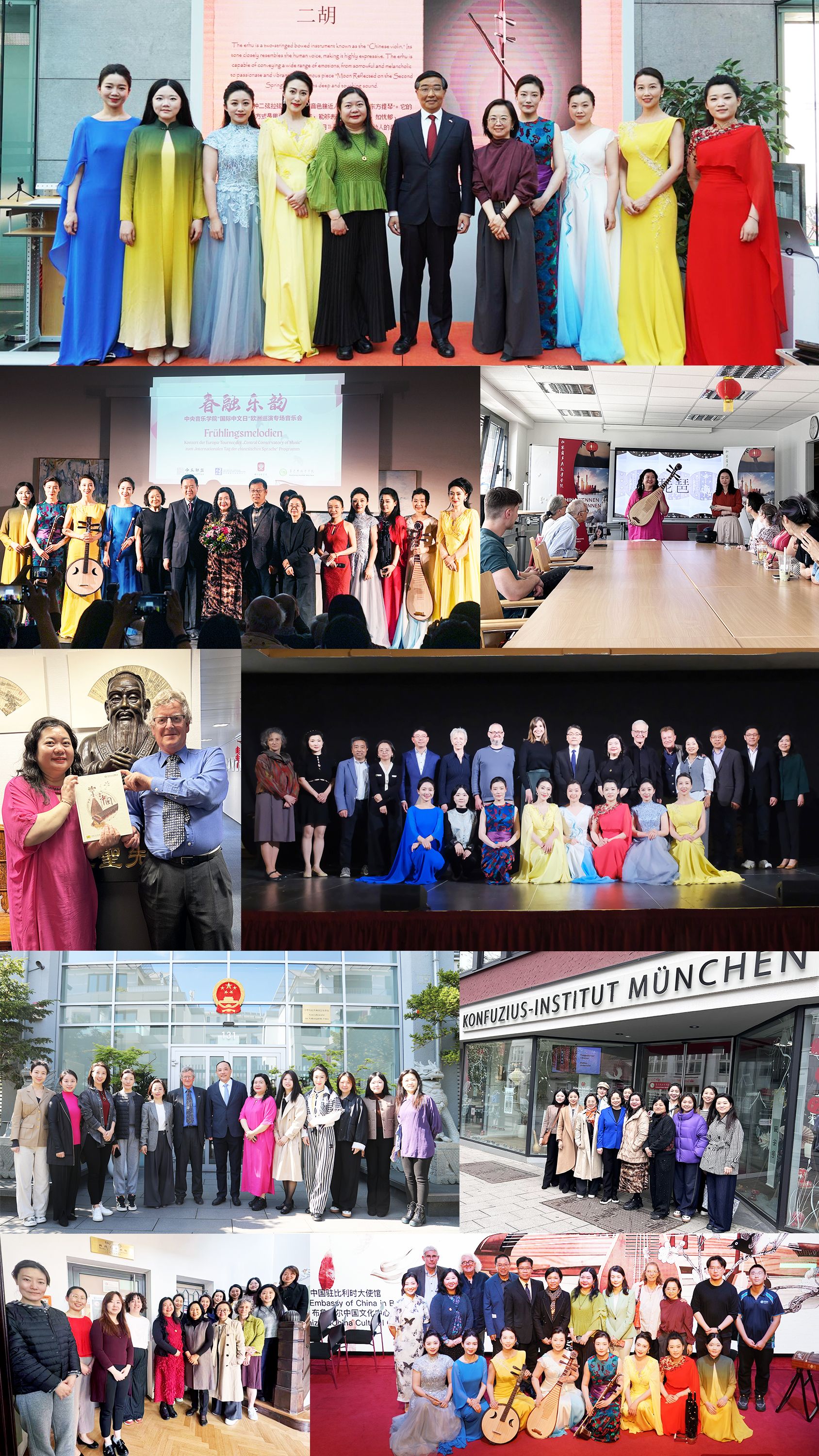 为庆祝由教育部中外语言交流合作中心(以下简称:语合中心)和中文联盟联合发起的2025年“国际中文日”活动,向世界集中展现博大精深的中华文化宝藏,4月25日至5月2日,在语合中心的支持下,KY开元音乐孔子学院办公室及国际中文教育(音乐)实践与研究基地主任樊薇、副主任张乐心组织由民乐系副教授王颖、苏畅、刘小菁,及青年教师邸琳、王一、马英俊、冯天石、高欣然组成的巡演团,赴德国、比利时4城市的孔子学院举办“春融乐韵”系列专场音乐会,以高水平、高质量的专业艺术水准,细腻生动的音乐演绎,积极向上的精神面貌,让欧洲听众近距离感受到中华民族音乐的独特魅力,所到之处博得多方赞誉。