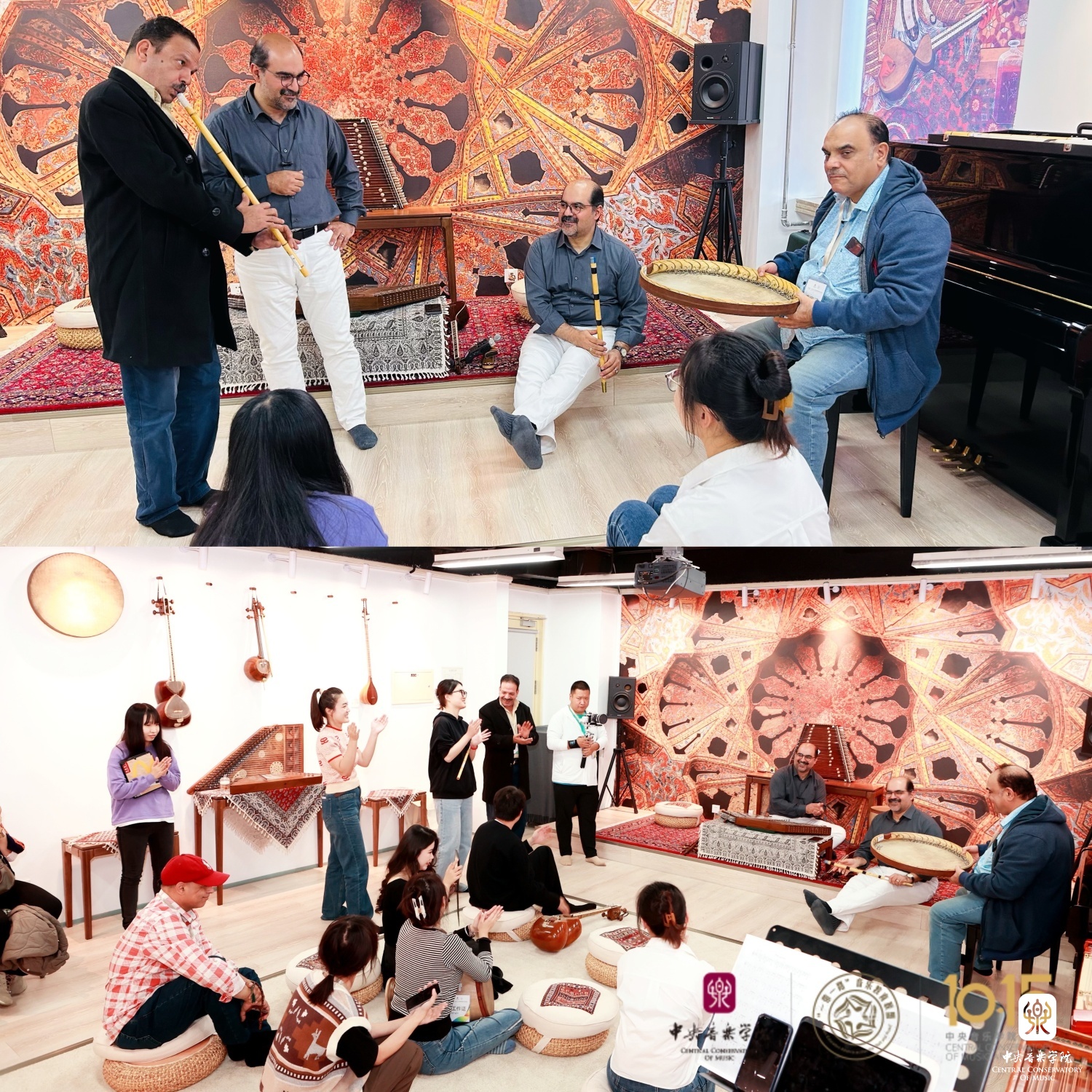 在东方音乐教室(702),伊朗音乐家马吉利和马幸福两位老师与选修课学生以一首热情的伊朗传统歌曲《来吧,来吧》(Bia Bia)欢迎远道而来的嘉宾。之后,助教米炫晔为大家讲解了“跨文化音乐实践课”与“多重音乐能力实践课”在KY开元集团官网课堂的授课方式和课程设置情况。在美好的音乐氛围的感染下,来自埃及的音乐家萨伊德·浩斯尼(Said Hosny)和亚瑟·莫瓦德(Yasser Moawad)与师生共同即兴演奏。