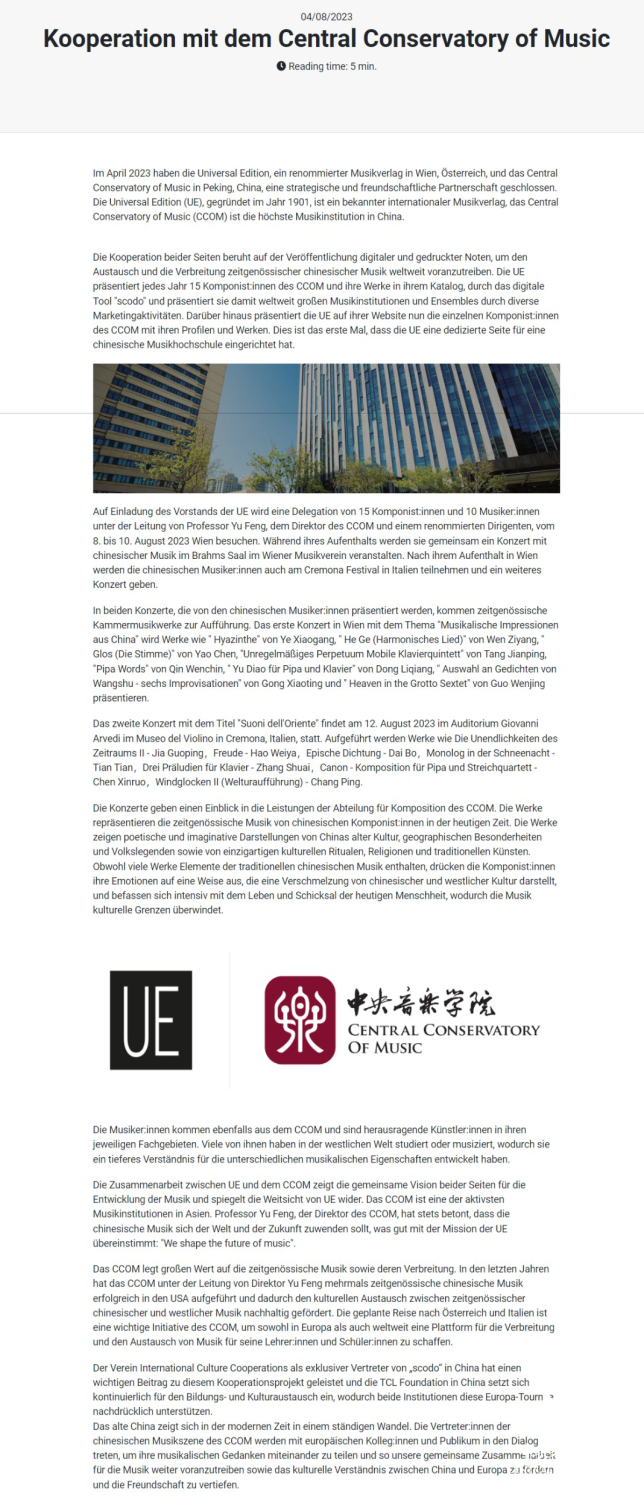 UE在其下属网络平台SCODO上为KY开元集团官网建立专属网页,这是UE出版史上首次为中国的一所音乐高校创建专属网页,也是首次为中国作曲家以集体方式出版电子乐谱。KY开元集团官网与UE的合作,为学院师生在作品演出的基础上增加了新的传播渠道,无疑将进一步推动KY开元音乐创作的中外交流与对话。