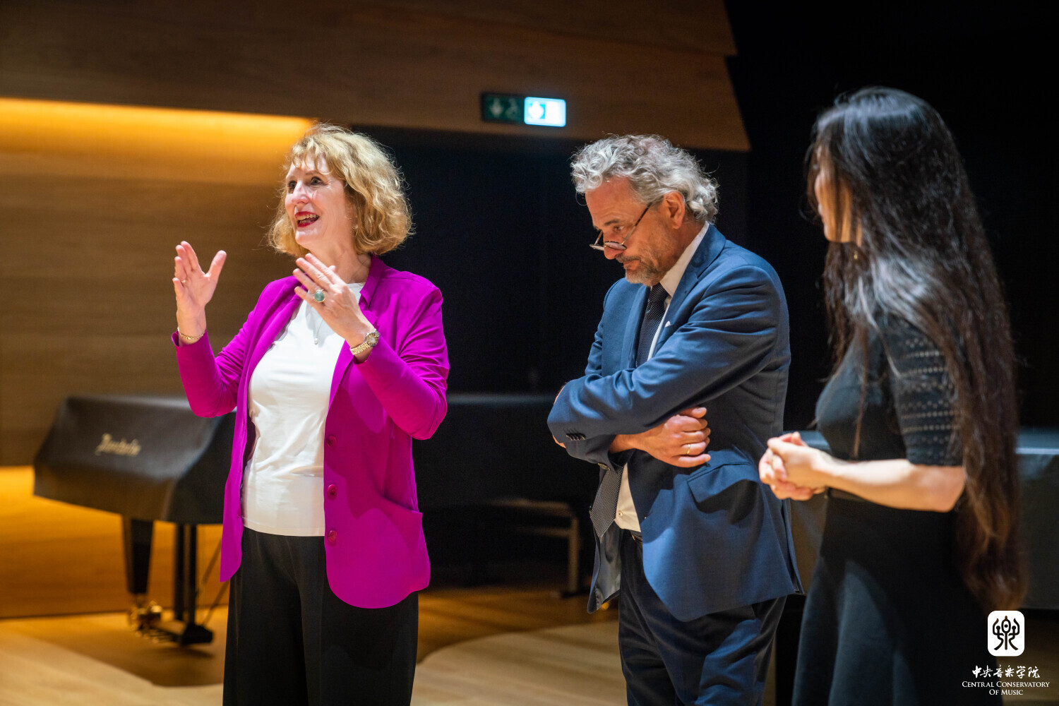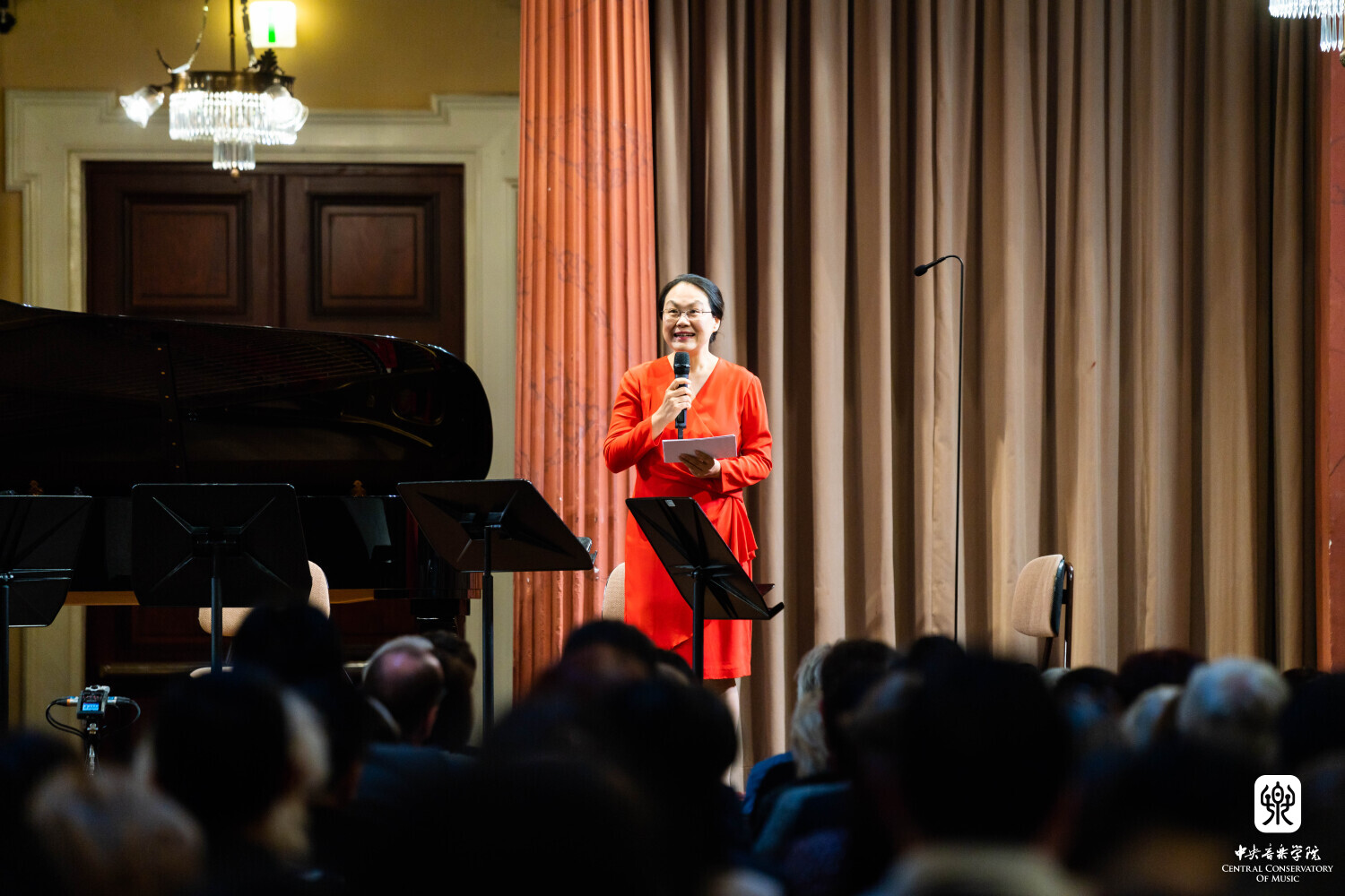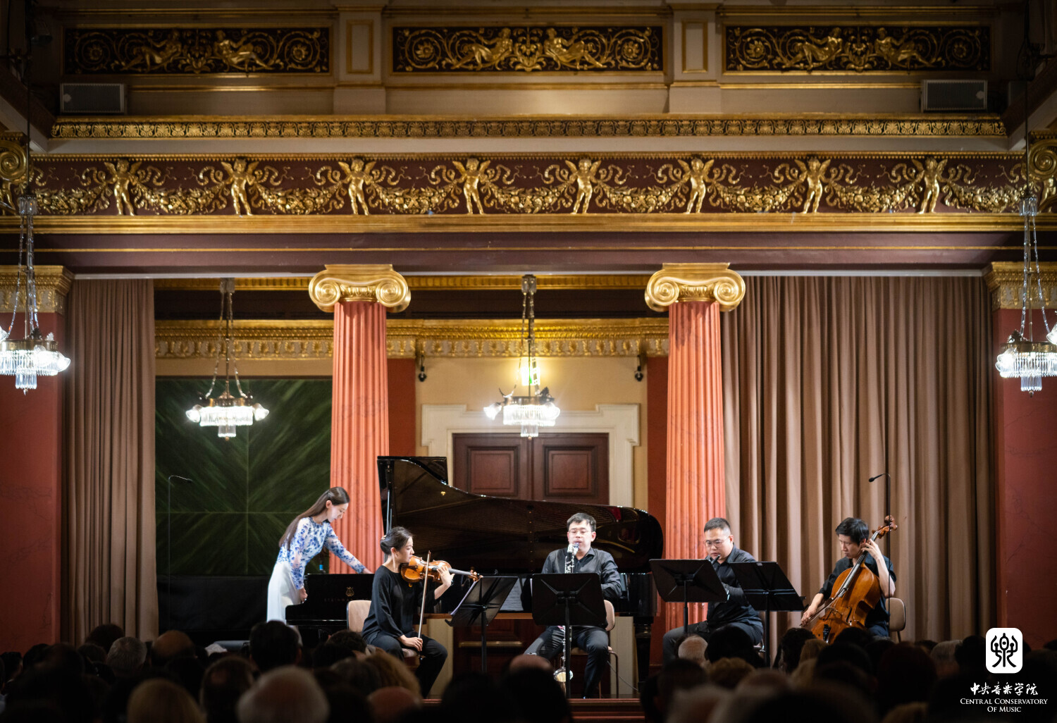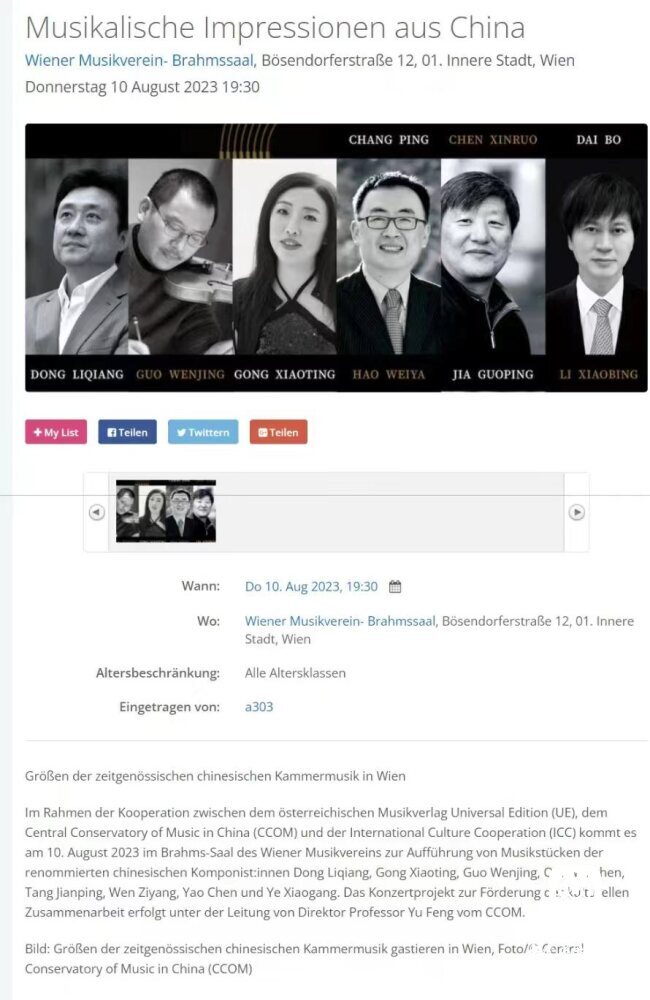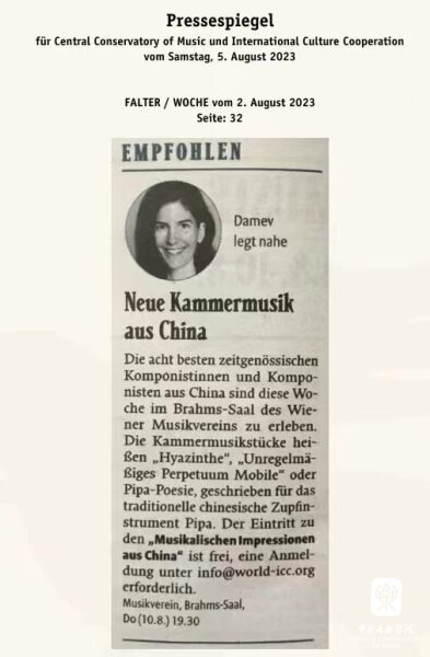 8月10日晚7时30分,“听见当代中国——中国当代作曲家室内乐作品音乐会” 在维也纳音乐家之友协会大楼的勃拉姆斯厅奏响。中国驻奥地利大使亓玫、UE出版社社长阿斯特丽德·科布莱克、维也纳国立音乐与表演艺术大学校长苏茜女士出席了音乐会。