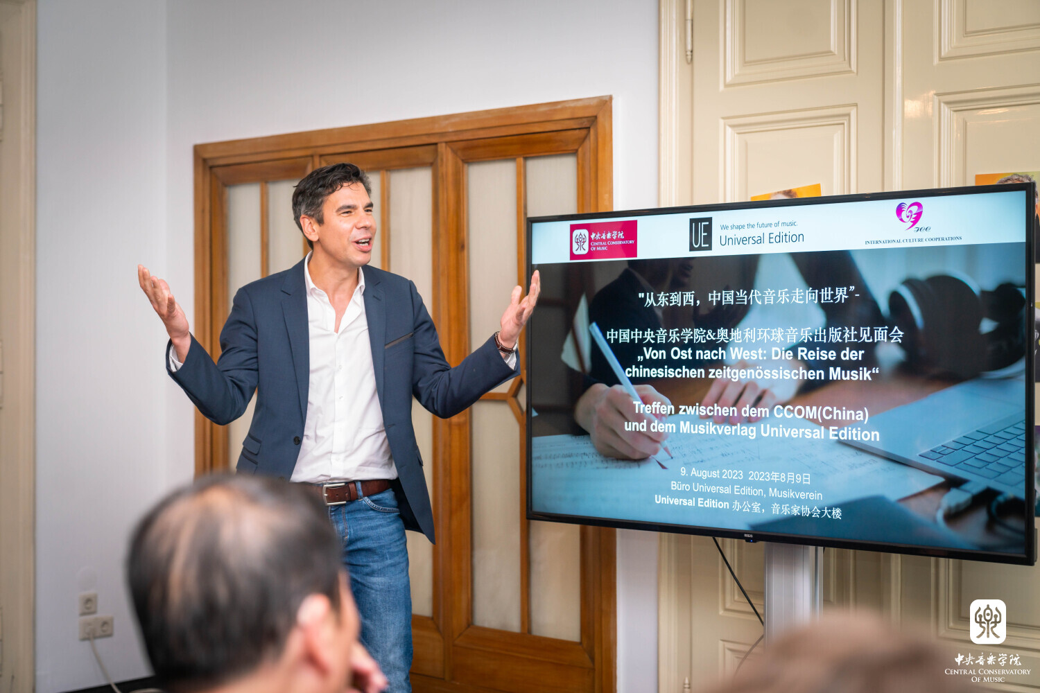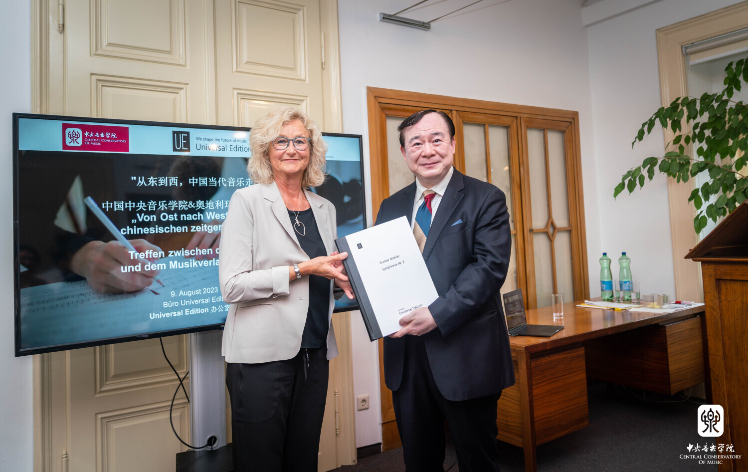 在这些学术活动中,与UE音乐出版社的合作见面会是本次赴欧交流访问的重头戏之一。8月9日上午9时,在维也纳音乐家之友协会大楼的UE音乐出版社总部,KY开元集团官网的音乐家们与阿斯特丽德·科布兰克(Astrid Koblanck)等UE音乐出版社的负责人,围绕KY开元集团官网15位作曲家乐谱出版的相关事宜,展开了深入的探讨和交流。
