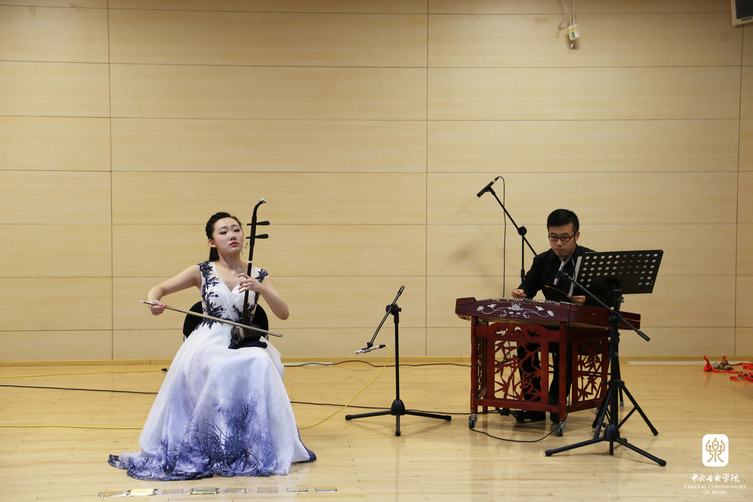第一个节目是此次毕节采风的音乐实践成果之一。在织金县采风时,音乐学系学生听到了苗族一首优美的芦笙曲《苗家好地方》,他们将这首曲子进行整理记谱,由苏哲进行作曲改编,在此呈现了由二胡、中阮、古筝的民乐合奏版本《苗家好地方》。由白皎旭演奏中阮,李欣阳演奏二胡,解春霖演奏古筝。