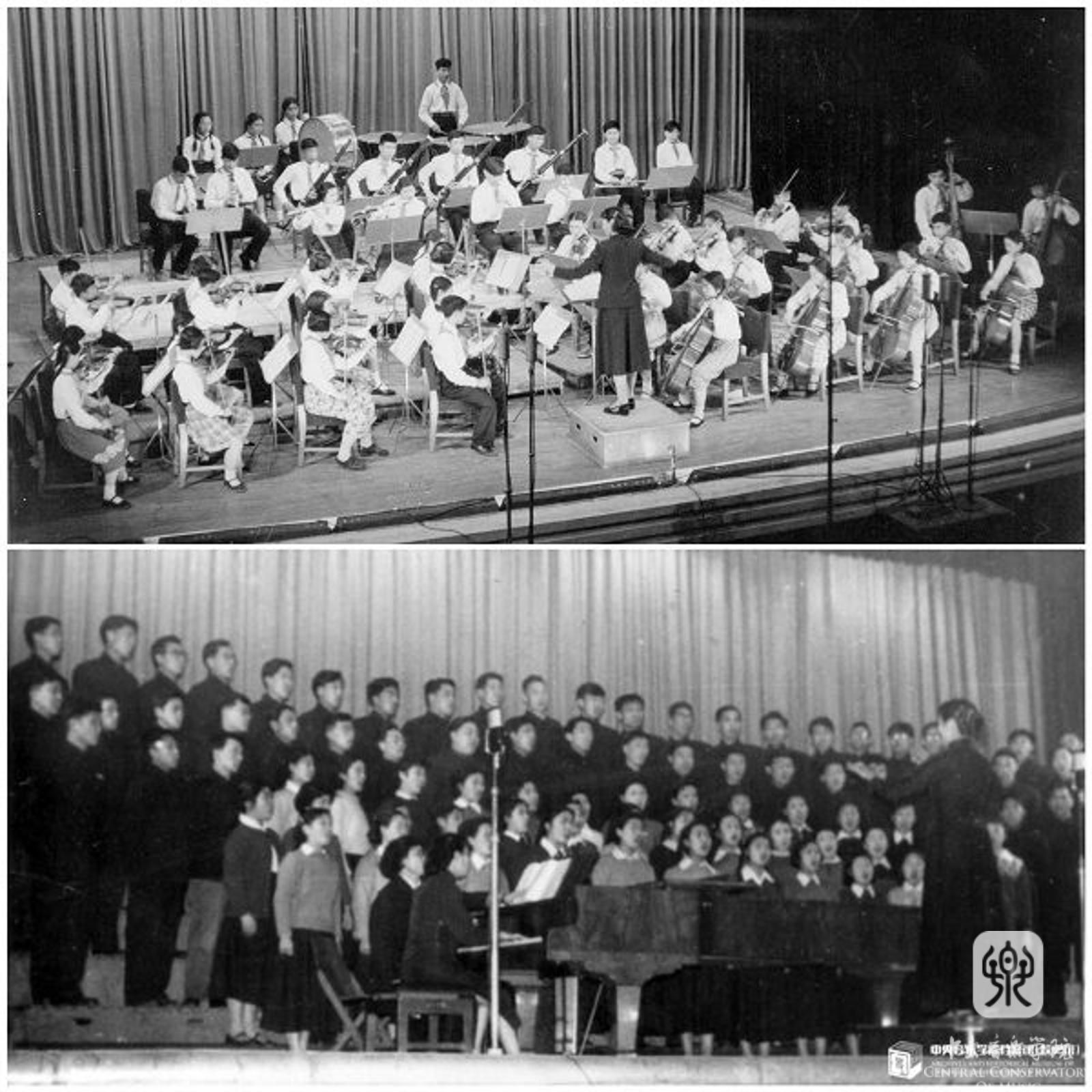 20世纪50年代末,郑小瑛分别指挥“央音”附中“红领巾”交响乐团(上)、大学生合唱团(下)演出