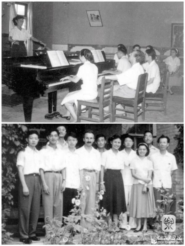 上图:苏联专家巴拉晓夫(钢琴前仰头者)在为郑小瑛上课