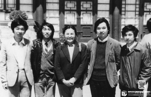 20世纪80年代,郑小瑛(中)与指挥系学生邵恩(左1)、胡咏言(左2)、王进(右2)、水蓝(右1)合影
