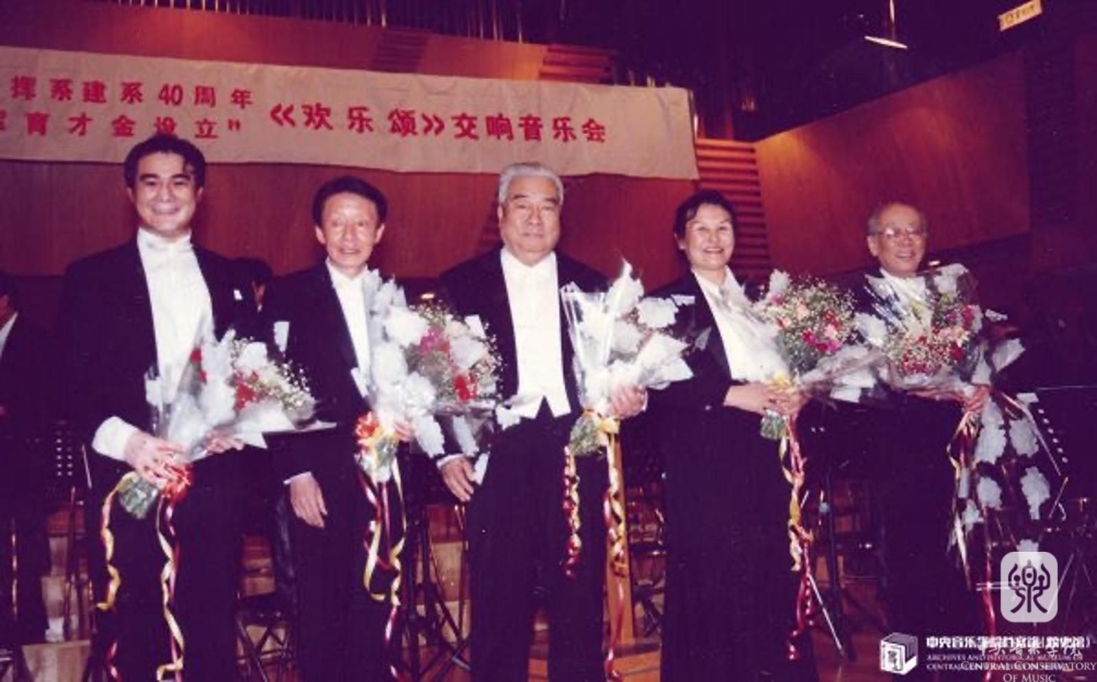 1996年10月,指挥系举办建系40周年庆典音乐会,著名指挥家李德伦和指挥系先后四位系主任合影。右起:黄飞立、郑小瑛、李德伦、徐新、俞峰