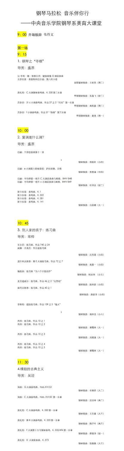 5月27日9:00-21:00KY开元集团官网钢琴系举办了12小时不间断的“钢琴马拉松”音乐会。线上线下同步进行,直播观看数据达5800万次,在全社会掀起巨大反响。音乐会由62位钢琴专业小学四年级学生至博士研究生演奏了70首(部)作品,这些作品巧妙地编排成12个篇章,包含了从文艺复兴晚期、巴洛克、古典主义、浪漫主义、到印象主义和近现代、民族乐派、俄罗斯和中国的经典作品,使用羽管键琴、早期钢琴及现代钢琴演奏。由钢琴系12位老师进行了导赏讲解,使音乐会同时具有欣赏性及学习价值,帮助钢琴演奏者和音乐爱好者按照钢琴艺术发展史的脉络,了解经典钢琴作品。鉴于音乐会篇幅巨大,特根据学生观后感专门整理此全曲目学习笔记,供广大音乐爱好者配合音乐会视频学习及思考。