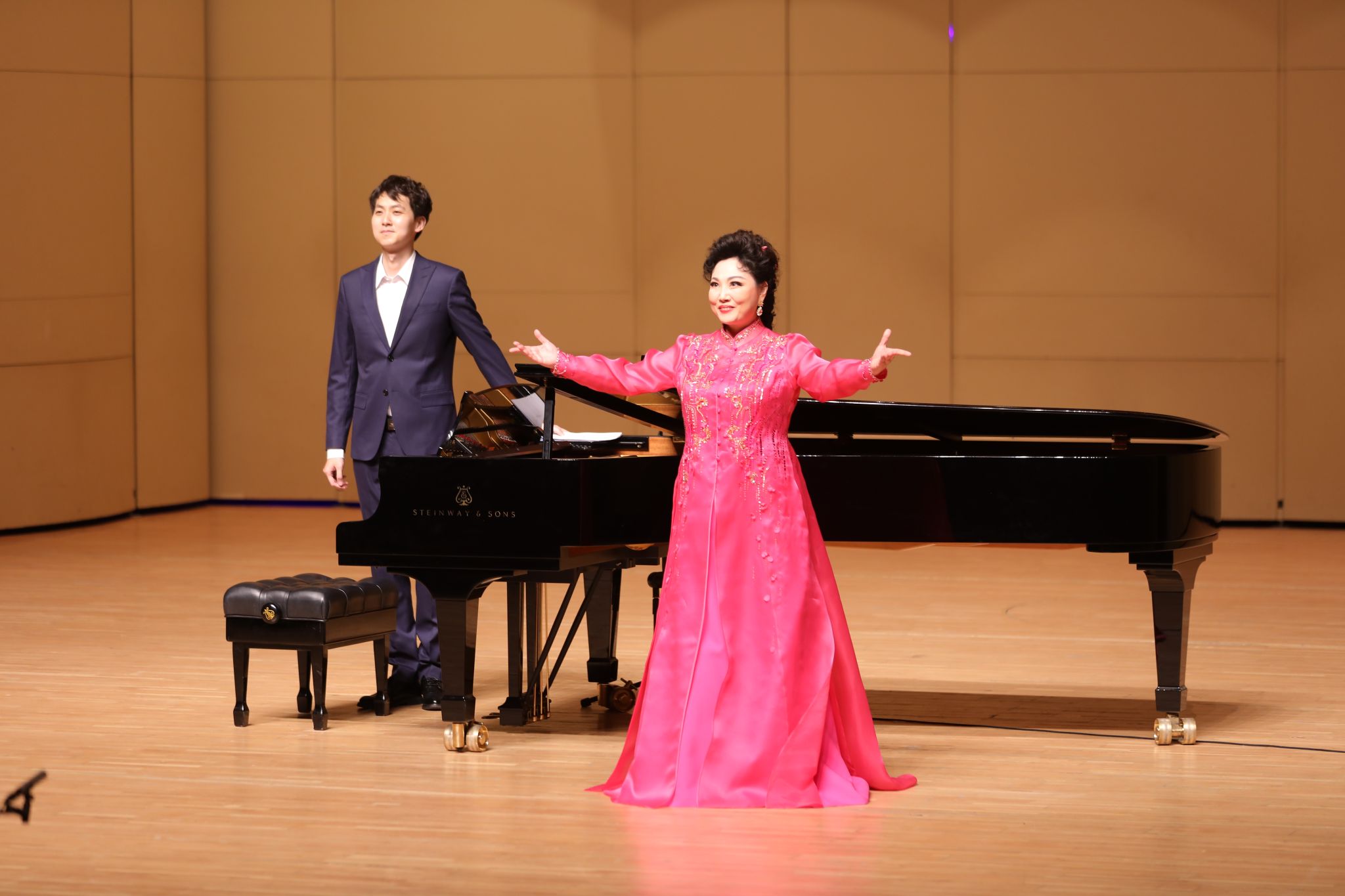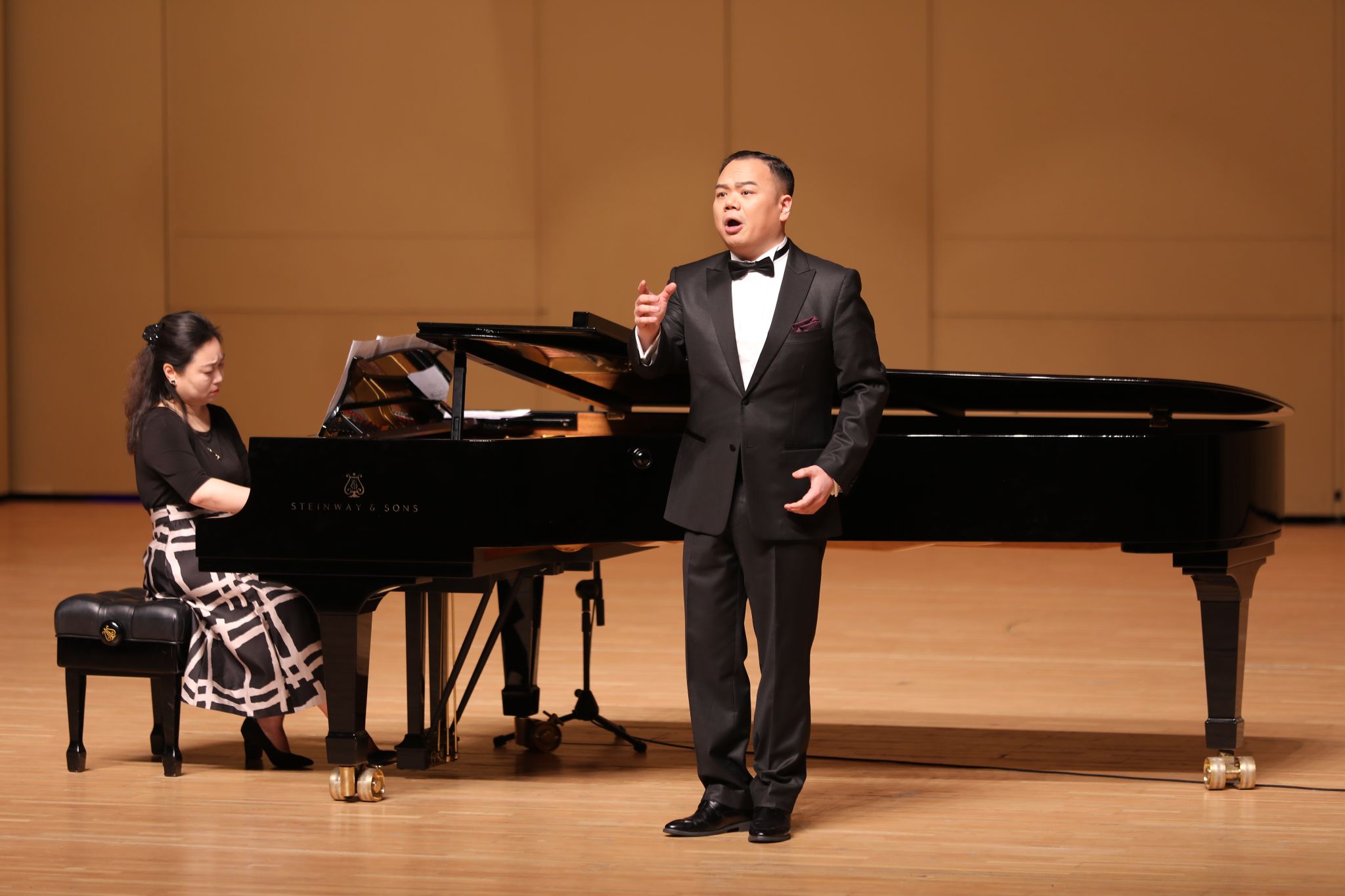 王传越的男高音为观众带来意大利民歌《你不要哭泣》,深情的演唱将歌曲中的忧伤与眷恋揉进每一个音符,通透的高音极具感染力;陈笠笠的女高音唱响广西民歌《山歌好比春江水》,清甜的嗓音搭配熟悉的旋律,把广西民歌的灵动与秀美展现得淋漓尽致。王喆的女高音演绎朝鲜族民歌《阿里郎组曲》,婉转的唱腔精准还原了朝鲜族民歌的独特韵律,悠扬旋律里藏着绵长的情感;张文巍的男低音唱响蒙古族民歌《敕勒歌》,低沉浑厚的嗓音搭配马头琴的悠远音色,“天苍苍野茫茫”的草原意境瞬间铺满全场。