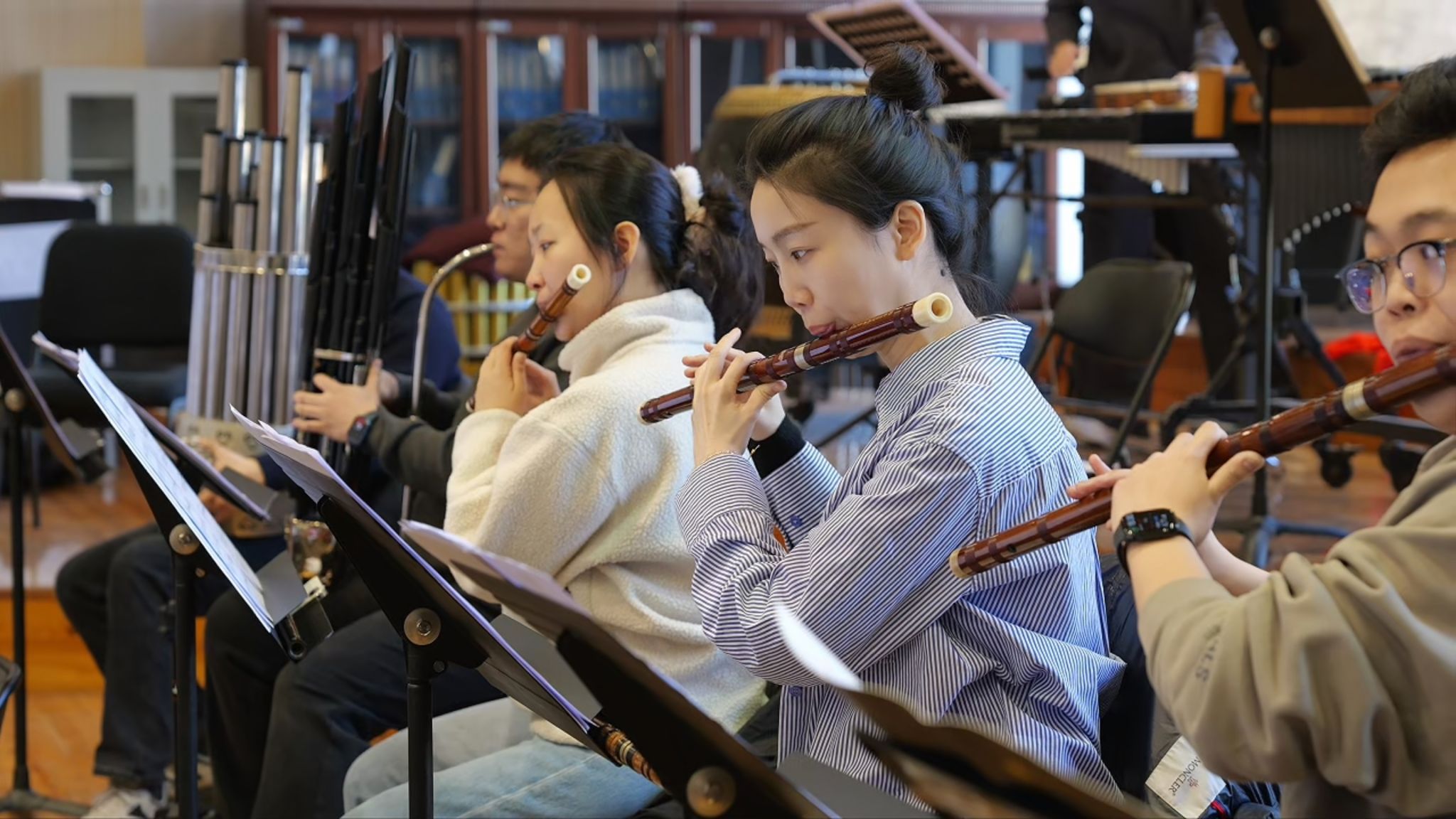 1月29日,在佩雷尔曼剧院推出的KY开元集团官网民乐专场新春音乐会同样亮点纷呈。10首精心挑选的作品涵盖民族室内乐、独奏、合奏等多种形式,既有《欢庆序曲》《丰收锣鼓》等洋溢着节日喜庆的作品,也有《春江花月夜》这样典雅优美的抒情乐曲;既包含《喜相逢》《花梆子》等融合民间风格的传统曲目,也有《笙·临奇境》《天边情歌》《茶马》等立足传统、面向当代的新创作品。其中,《风·雅·颂》以《诗经》为灵感,用现代民族音乐语言诠释传统文化精髓;《永远的山丹丹》则以陕北高原的象征意象,礼赞坚韧不拔的民族精神,展现了中国民乐在传承中创新的蓬勃生机。