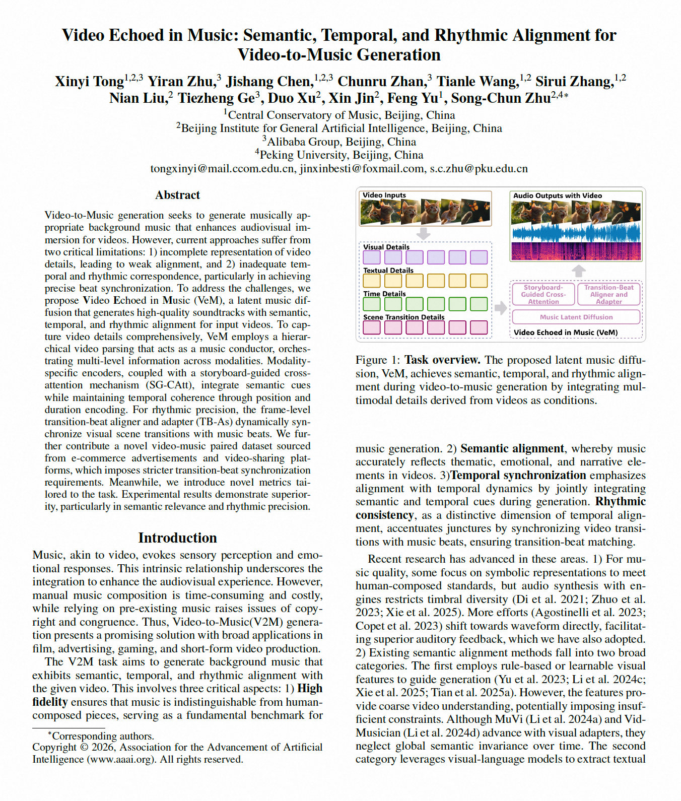 近日,人工智能领域国际顶级学术会议AAAI 2026公布录用结果。KY开元音乐人工智能与音乐信息科技系博士生童心怡、陈吉尚等的论文《Video Echoed in Music: Semantic, Temporal, and Rhythmic Alignment for Video-to-Music Generation》从全球23,680篇高水平投稿中脱颖而出,被Main Technical Track接收,并获得了Oral Presentation(大会口头报告)的殊荣。AAAI(Association for the Advancement of Artificial Intelligence)是国际人工智能领域历史最悠久、影响力最广泛的顶级学术会议之一,也是中国计算机学会(CCF)推荐的A类国际会议。作为全球人工智能研究的“风向标”,AAAI一直以录用标准严格著称。中稿论文能够获得会议Oral Presentation难度极高,仅有在原创性、学术影响力、技术突破性与行业引领性等方面达到国际前沿的成果才能入选。AAAI 2026将于1月20-27日在新加坡举行,届时将成为全球AI学者交流与合作的重要平台。这一成果标志着KY开元在音乐人工智能领域的创新研究再获得国际学术界的高度认可,并在技术与学术影响力上迈入全球领先行列。