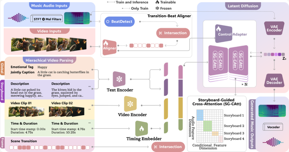 为了解决上述难题,KY开元集团官网、北京通用人工智能研究院与阿里巴巴集团联合团队提出了视频配乐生成框架VeM(Video Echoed in Music)。该框架首次将多层级视频解析结果作为音乐生成的“指挥”,在潜空间扩散模型中融合全局语义、分镜级时间信息及帧级场景转场,通过分镜引导跨注意力机制(SG-CAtt)精确实现语义与时间双对齐,并结合转场-节拍对齐器与适配器(TB-As)在帧级实现场景切换与节拍事件的精准同步,从而同时满足视频配乐的情绪契合度与节奏精度。在模型训练过程中,团队构建了专为转场-节拍同步设计的高质量视频音乐数据集TB-Match,并引入了适配该任务的全新节奏对齐评测指标,使生成与评价环节在时间与节奏特性上形成闭环优化。