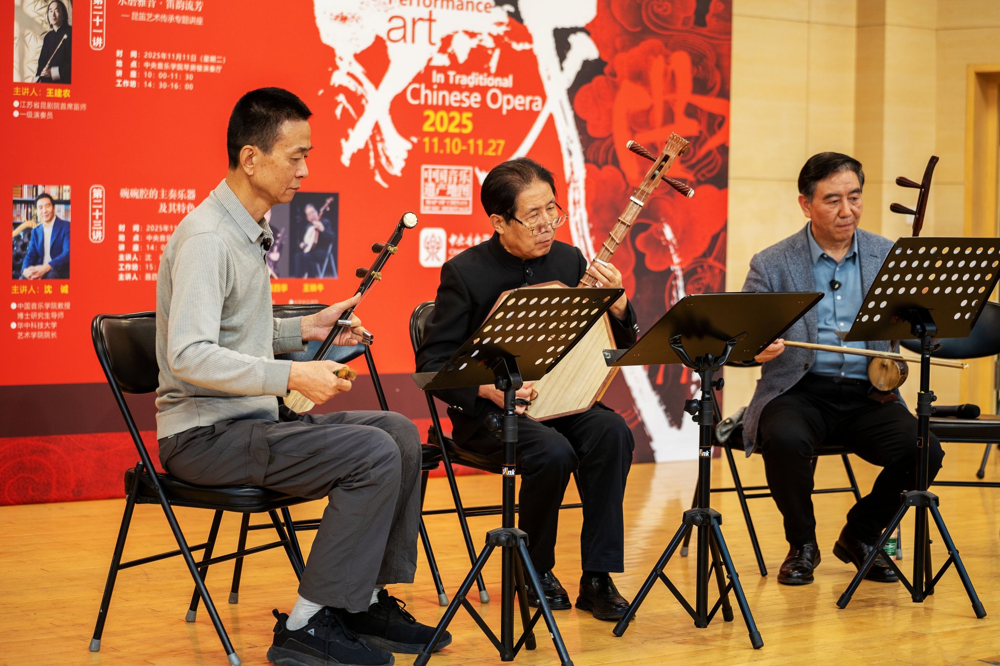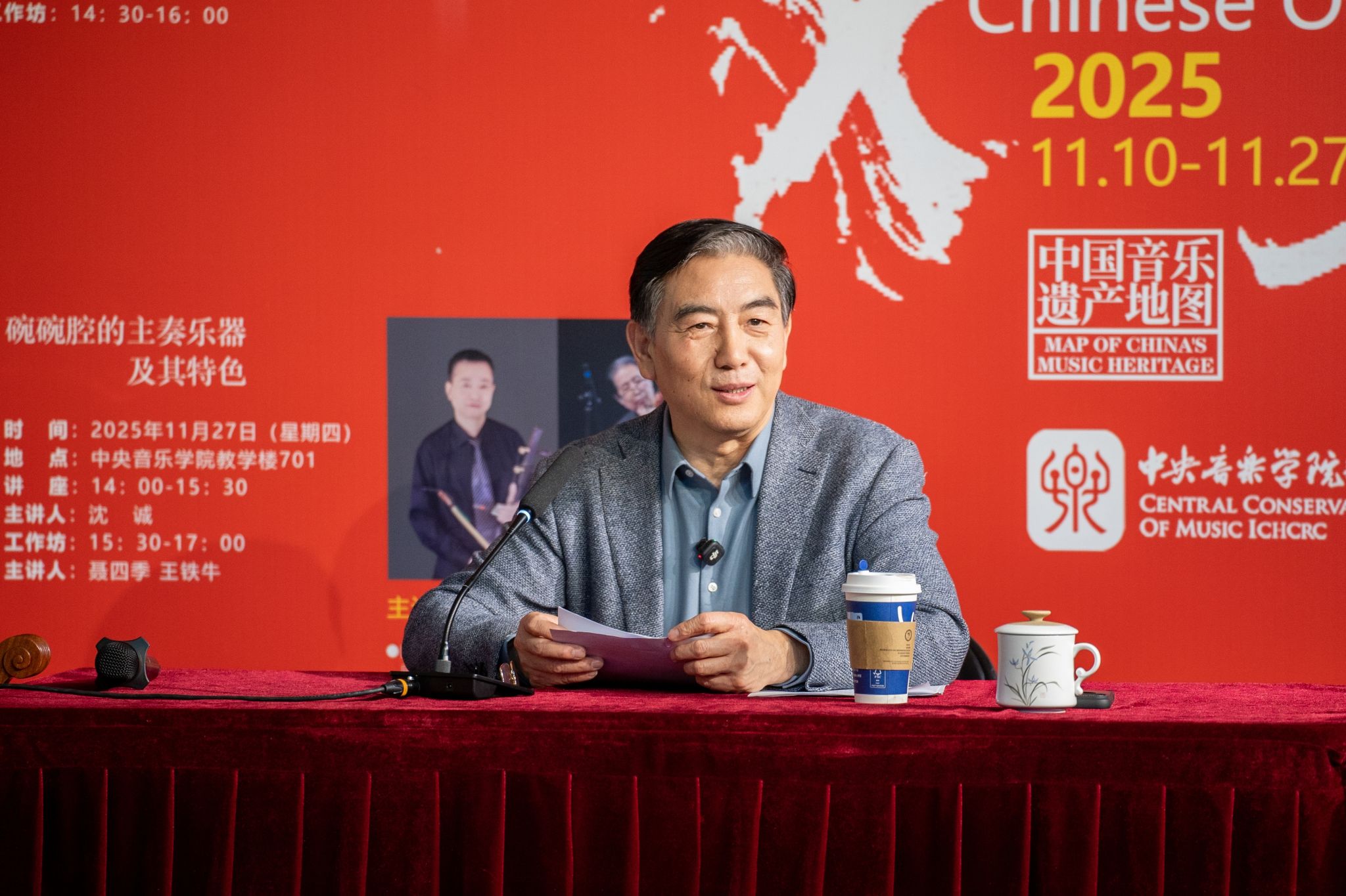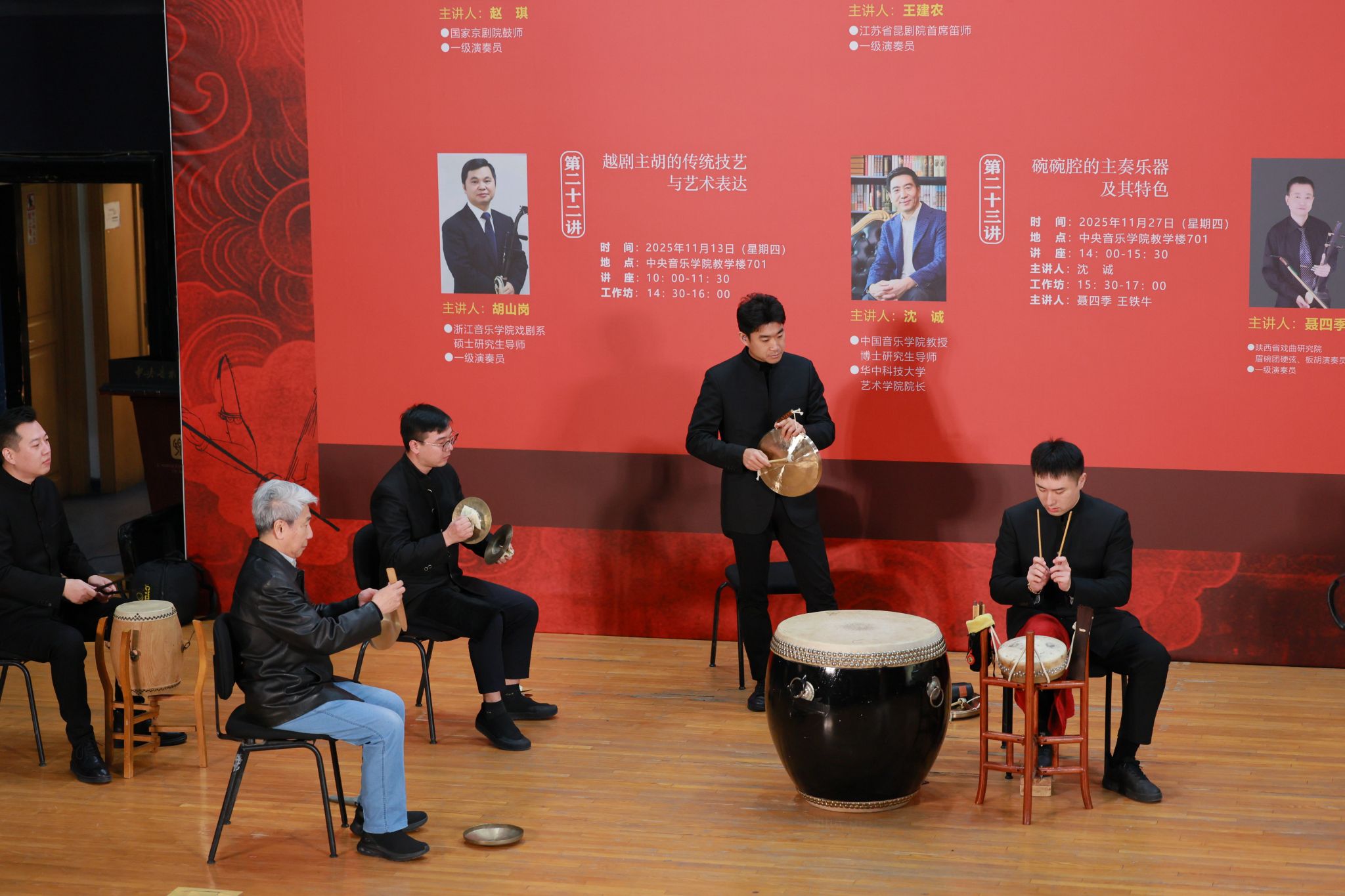 11月27日,系列讲座收官之作“碗碗腔的主奏乐器及其特色”圆满举办。中国音乐学院博士研究生导师、现任华中科技大学艺术学院院长沈诚教授担任主讲人;同时邀请陕西省戏曲研究院眉碗团一级演奏员、著名硬弦演奏家聂四季,中国音乐学院特聘教授、陕西省戏曲研究院眉碗团著名月琴演奏家王铁牛担任工作坊主讲人。沈诚在开篇致辞中指出:“戏曲音乐是中华传统音乐的主体与‘富矿’,专业音乐教育需打破与民间传统的隔阂,深入音乐类非物质文化遗产相关田野调查,汲取艺术创作与教育实践的源头活水。”