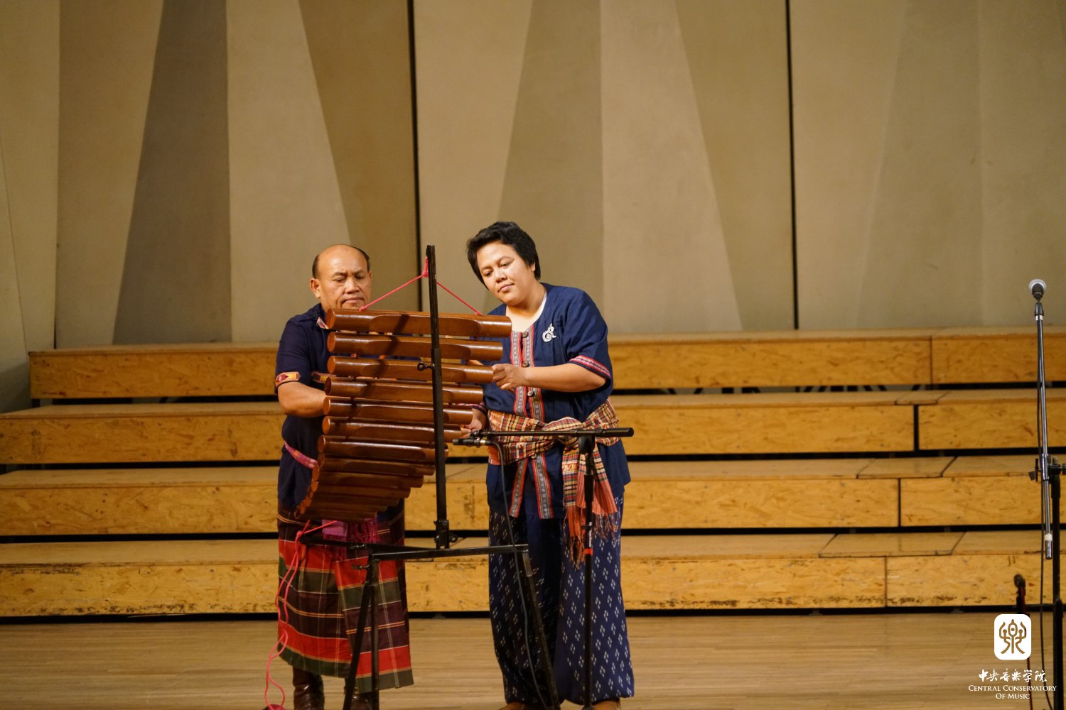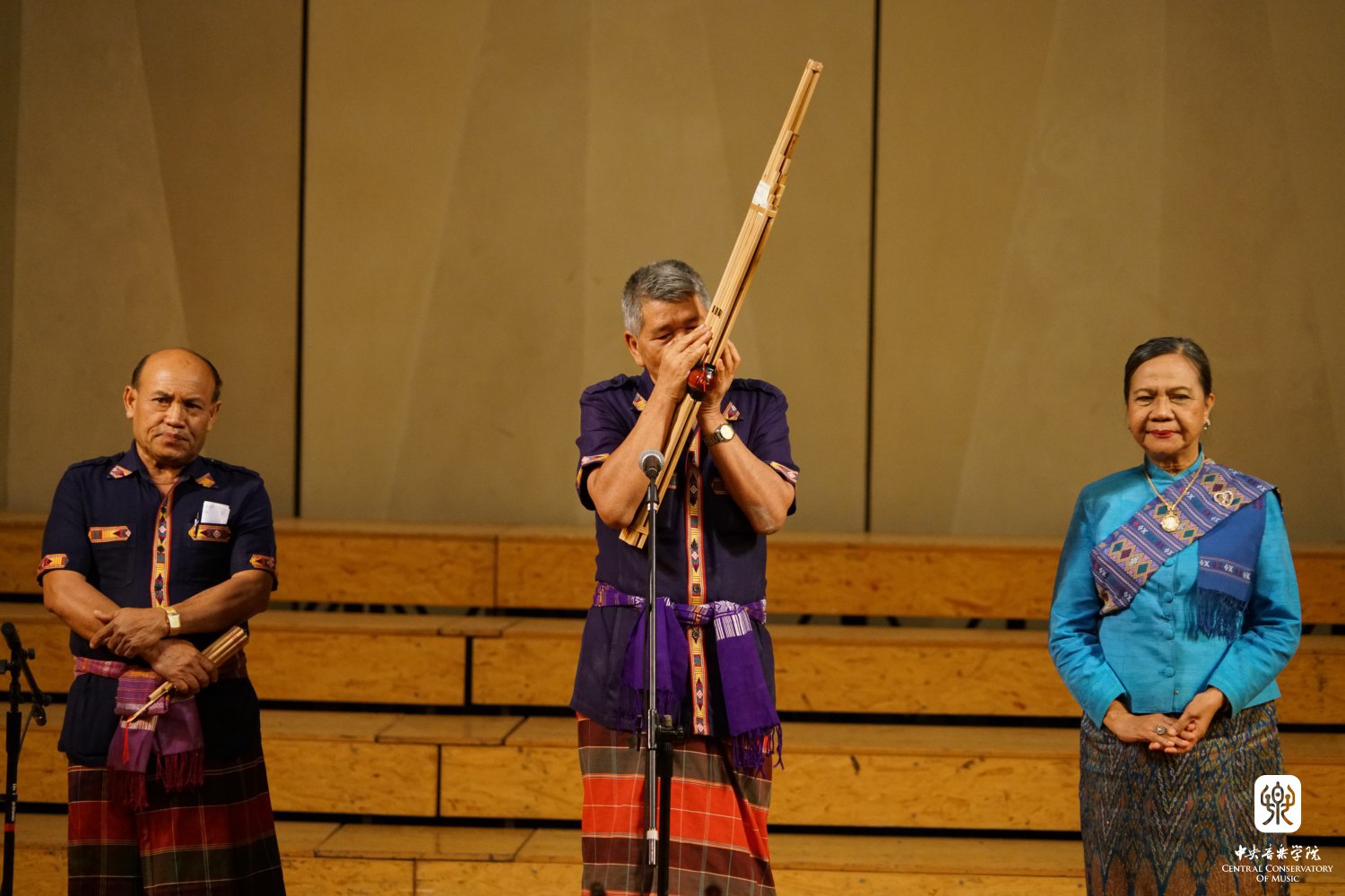 第三板块是泰国传统音乐展演,来自泰国的郎民间音乐表演艺术团表演了泰国东北部的民间音乐。四位音乐家是来自泰国玛哈沙拉堪皇家大学音乐系的助理教授杰拉尔凯伊·克霍恩派尔洛特博士,泰国那空帕农大学的民族音乐学博士、杰出的莫兰音乐歌唱家拉特利苏芮魏莱·伯恩斯泰蓬夫人,杰出的民间音乐(兀特和蓬朗)演奏家宋萨卡·普莱图穆森先生,卡恩专业演奏家、那空帕农大学讲师约提卡斯里魏莱·伯恩斯提魄恩女士。主持人安平教授依次介绍了演出使用的四种泰国乐器,流行于泰国东北部的双排竹管的芦笙坎恩(Khaenan),由12或者13个竹管围成一圈的吹奏乐器Wot(兀特),一种长颈弹拨琉特琴Pin(聘),由12根硬木组成的泰国东北木琴Pong lang(蓬朗),四位演奏家为现场观众演示。