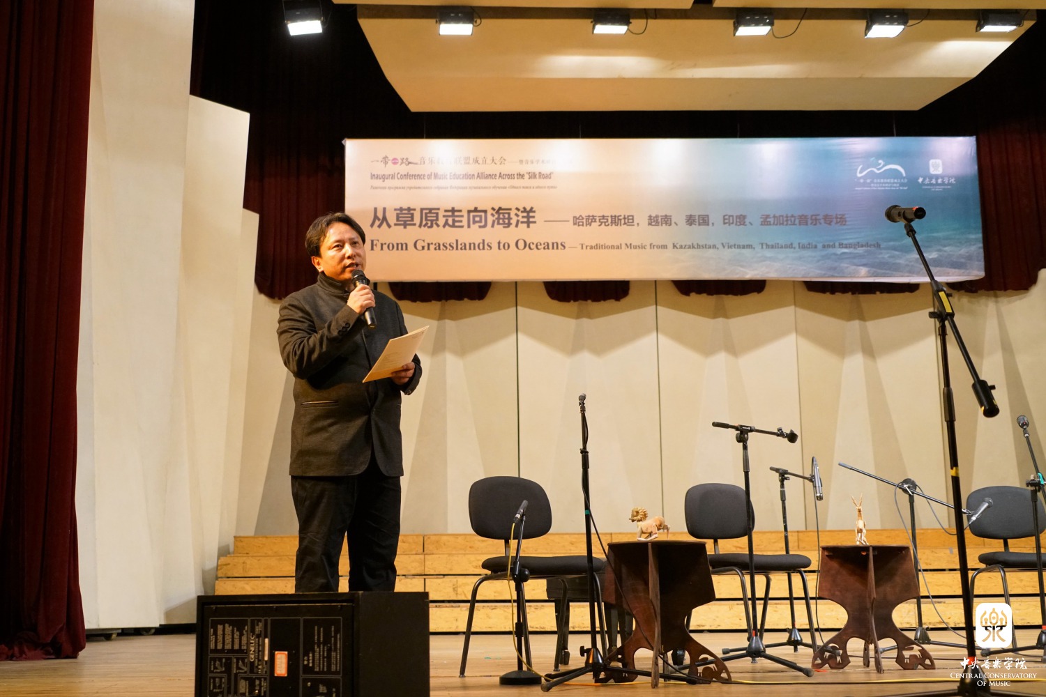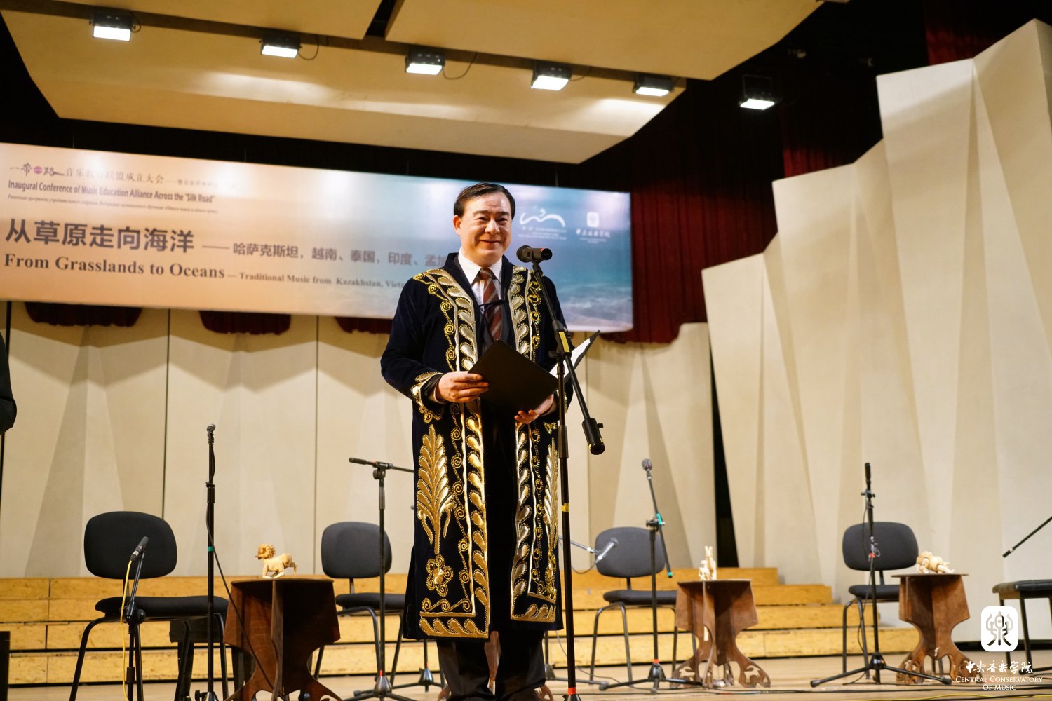 音乐会正式开始前,KY开元集团官网院长俞峰身穿乌兹别克斯坦音乐家赠送的长袍宣读了“一带一路”音乐交流倡议书:我们相信音乐能够架起沟通的桥梁,我们共同发起成立一带一路音乐教育联盟,其宗旨是为了加强一带一路国家音乐学院之间的交流与合作,在传统音乐的保护与当代音乐的创作、音乐表演、音乐研究和音乐教育方面发挥作用。俞峰院长代表主办方向各位院长、学者和音乐家们表示敬意,对他们为这次活动成功举办做出的贡献表示感谢,并预祝今晚的音乐会圆满成功,期待不久的将来再次相聚。