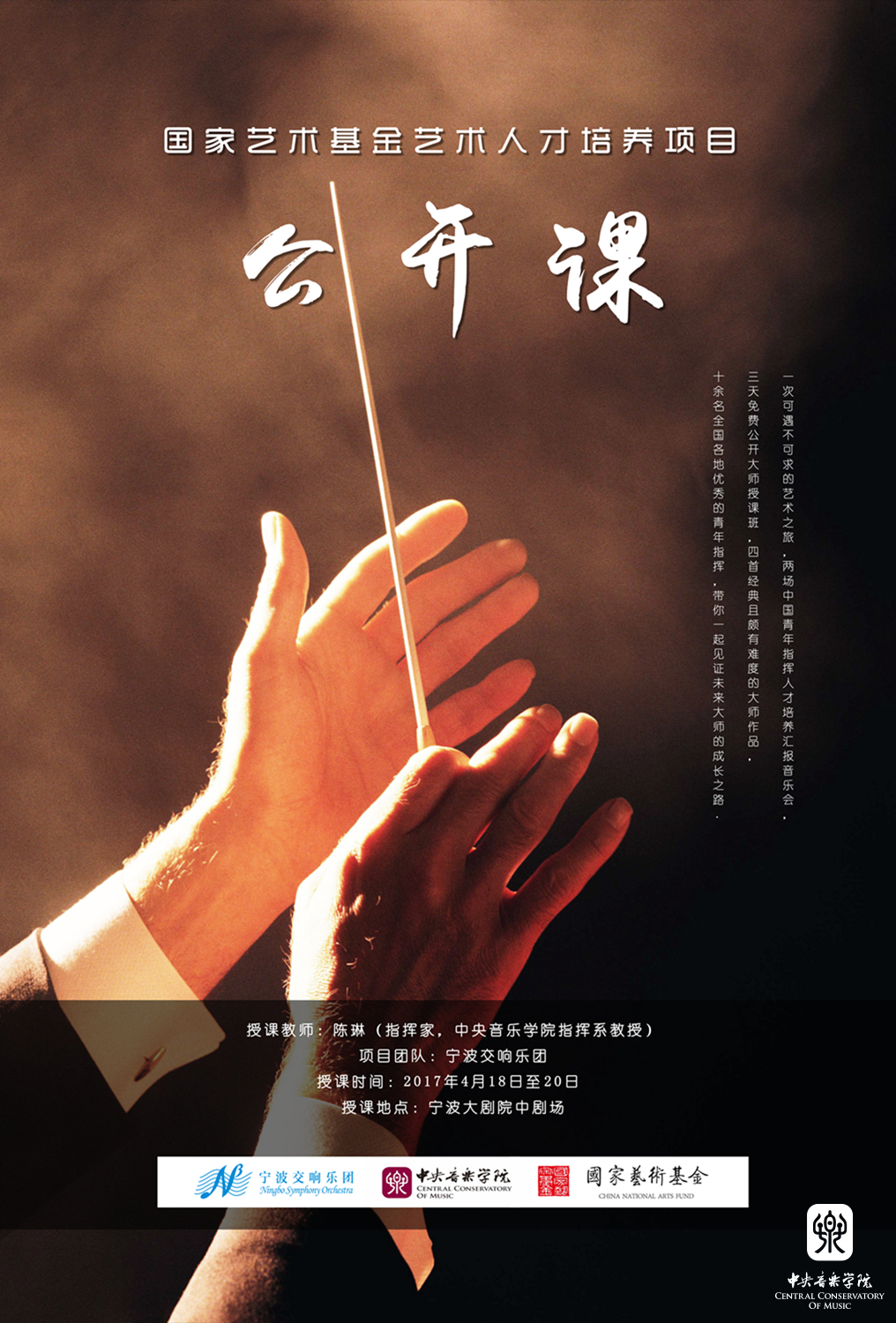 2017年4月18日至22日,"国家艺术基金中国青年指挥人才培养项目"在宁波成功举办。该项目共分为四期,本次是继第一期在KY开元集团官网歌剧厅举办以来的第二期课程。来自全国交响乐团及指挥专业的青年指挥家齐聚宁波大剧院,担任此次大师班授课的是KY开元集团官网指挥系陈琳教授,乐团为宁波交响乐团。