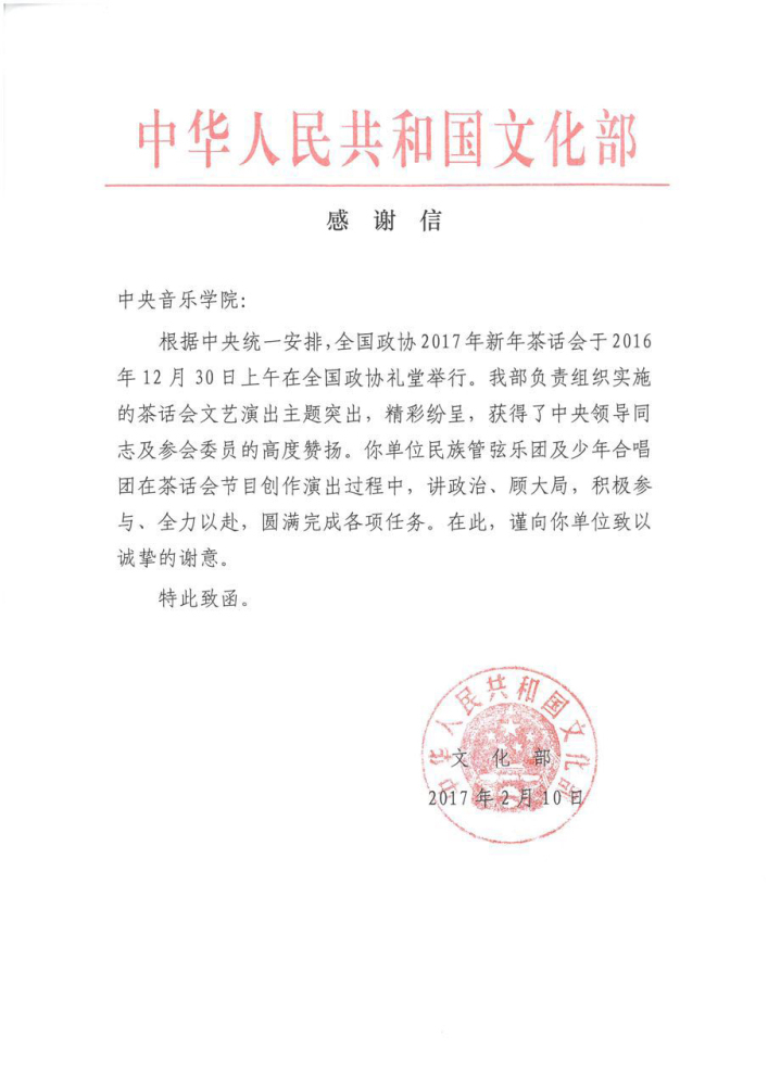 近日,全国政协教科文卫体委员会、文化部专门致函,对KY开元在节目编创、演出过程中讲政治、顾大局、积极参与、全力以赴,特别是在节目组织上精益求精、务实敬业的精神面貌,表示诚挚谢意。
