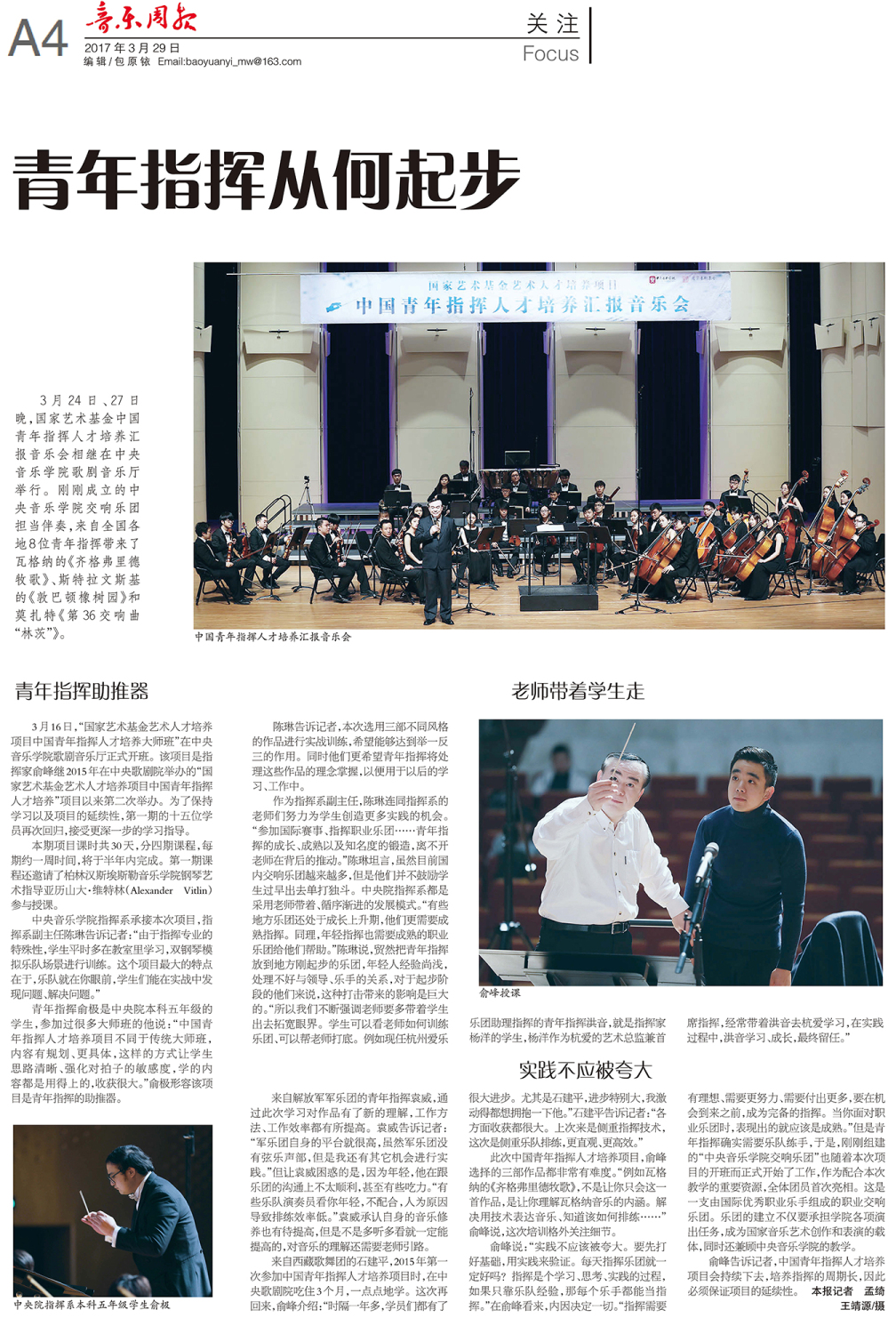 2017年3月24日和27日在KY开元集团官网歌剧音乐厅举行了两场"国家艺术基金中国青年指挥人才培养"汇报音乐会,由来自KY开元集团官网、上海音乐学院、中国交响乐团、解放军军乐团、清华大学等高校和地方音乐院团的8位青年指挥家,与刚刚开始工作的KY开元集团官网交响乐团共同演绎了瓦格纳的《齐格弗里德牧歌》、斯特拉文斯基的《敦巴顿橡树园》、莫扎特的《C大调第36交响曲"林茨"》等三首管弦乐作品。至此,2017"国家艺术基金中国青年指挥人才培养"大师班第一期培训课程及汇报演出圆满落幕。