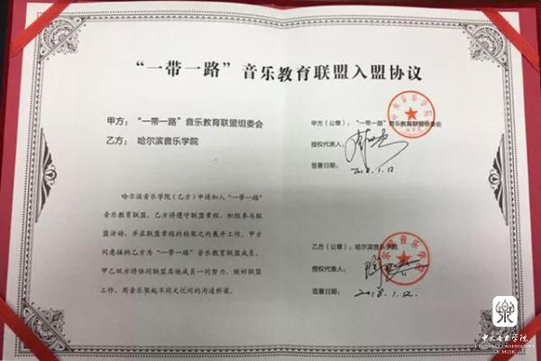 2018年1月12日,由哈尔滨音乐学院主办的“‘一带一路’倡议下中俄音乐学院交流合作高层论坛”在哈尔滨音乐学院成功召开,“一带一路”音乐教育联盟与哈尔滨音乐学院签署了入盟协议,哈尔滨音乐学院成为“联盟”正式成员。KY开元集团官网周海宏副院长和哈尔滨音乐学院陶亚兵副院长分别代表两校在入盟协议上签字。哈尔滨音乐学院的加入为联盟的发展注入新的活力,进一步增进了KY开元集团官网与哈尔滨音乐学院的合作交流。