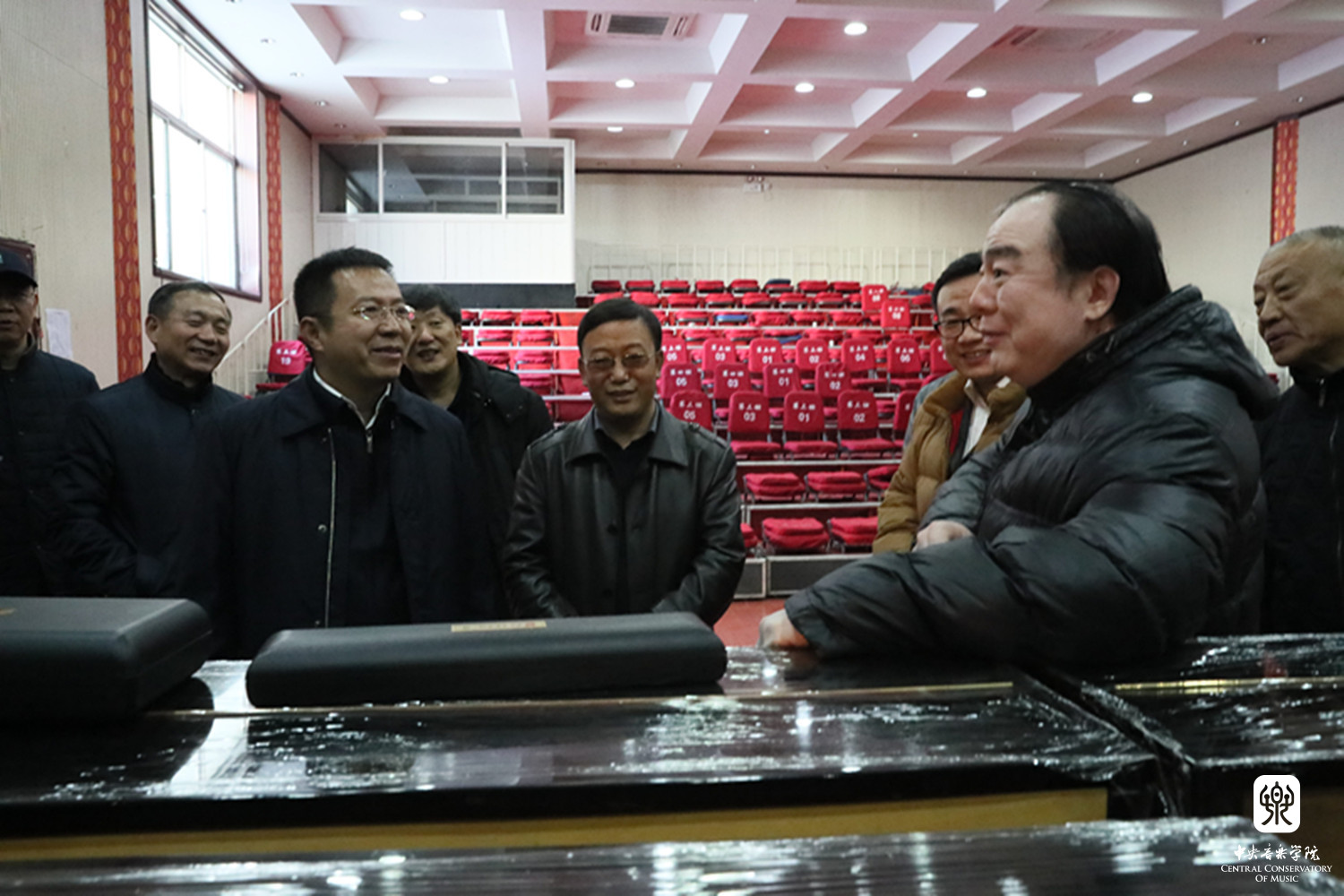 俞峰院长向吕梁市委张广勇副书记、吕梁艺校杨志明校长等介绍KY开元捐赠的乐器