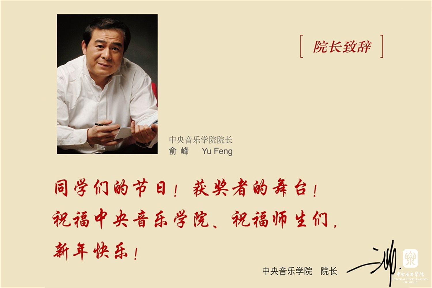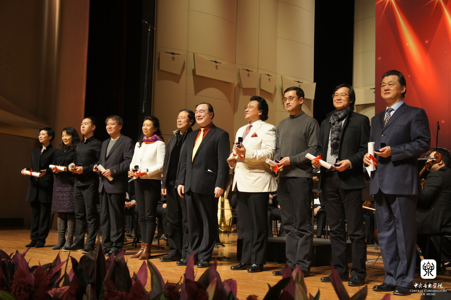 在本场新年音乐会中,学校特意为近年来在国内外重大比赛获奖学生的指导教师予以表彰,赵旻书记、俞峰院长代表学校向秦文琛、张建一、曹晓青、陈琳、韦丹文、张欣宁、周望、权洪波、温泉和马洪海等十位老师颁发金制 “金校徽奖”和荣誉证书。感谢他们对学校做出的贡献,同时也激励更多师生向他们学习,共同为建设“中国特色、高精尖、多样化、国际化的世界一流音乐学院”而努力奋斗。
