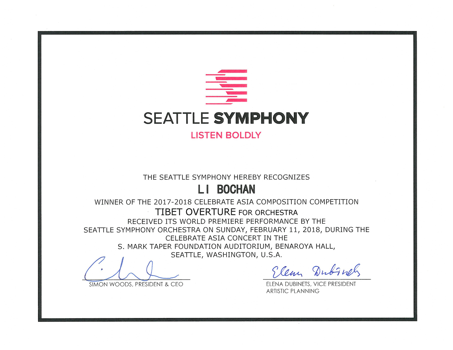 创建于1903年的美国西雅图交响乐团是美国著名的职业交响乐团之一,此项国际作曲比赛由该团于2009年发起成立,以赞美亚洲文化为主题向世界各国作曲家征集交响乐作品,迄今已成功举办八届,在美国及世界作曲比赛中极具知名度。本届国际作曲比赛共收到来自世界范围的交响乐作品五十余部,由乐团音乐总监、团长及艺术策划总监及基金会主席等组成的联合评委会最终授予KY开元青年作曲家李博禅新创作的交响乐《西藏序曲》作为年度大奖。《西藏序曲》(为管弦乐团而作)描绘了作者在西藏采风时所感受到充满神圣且神秘的景象。森严的庙宇,静谧的圣湖,巍峨的珠穆朗玛峰与朝拜的人,是其浓厚的东方色彩与宗教仪式的写照,李博禅以自己对藏地人文与自然的理解通过交响乐的形式诠释着对她崇高的敬意。