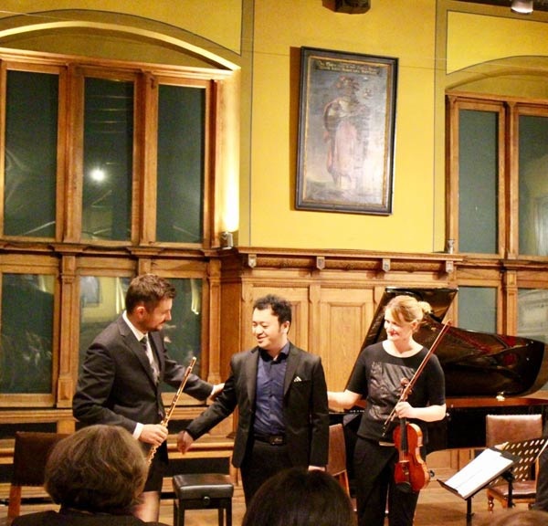 | 代博(中)与新四重奏团第一小提琴(右)和长笛演奏家乌卡什·德乌戈什在台上 |