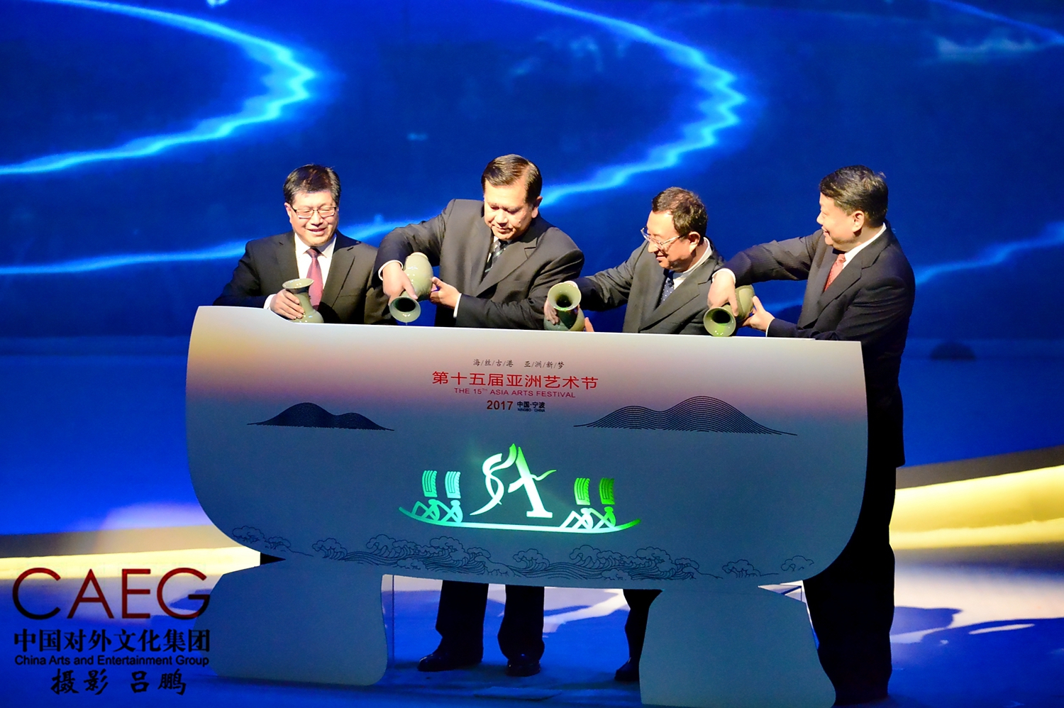 四位嘉宾上台为第十五届亚洲艺术节揭幕