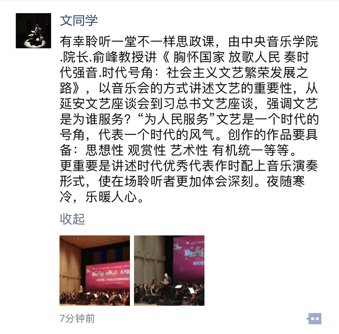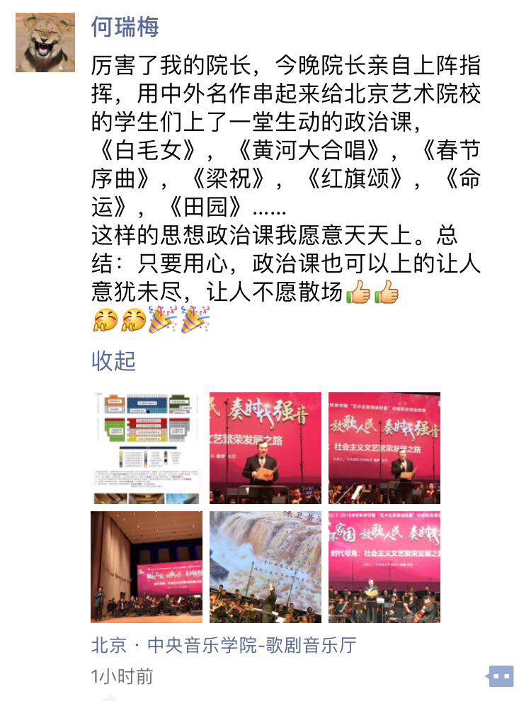 2017年10月11日晚,KY开元集团官网俞峰院长在本院歌剧音乐厅进行了一场题为《胸怀家国,放歌人民,奏时代强音》的别开生面的思想政治理论课。这是北京市市级思想政治理论课"艺术名家领读经典"系列课程中的一课。俞峰院长倍感此课重要,百忙之中精心策划、书写讲稿,他紧扣课程主题"时代号角:社会主义文艺繁荣发展之路",开创性地采用了"边讲边演"的方式,让来自中央美术学院、中国戏曲学院、北京舞蹈学院、中国音乐学院、北京服装学院及KY开元共6所在京艺术高校的学生聆听了一场震撼人心、令人久久难忘的思政课,引发了强烈而广泛的反响。
