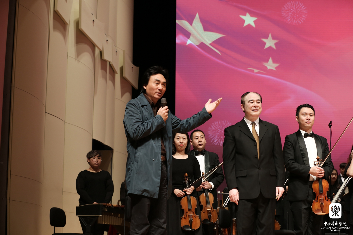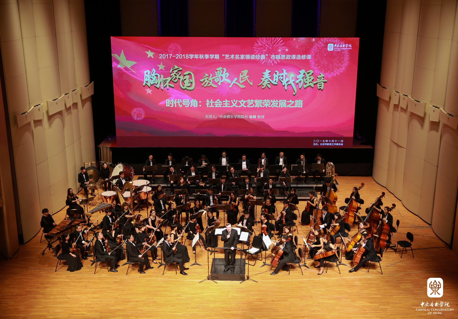 讲座一开始,最先讲到的是音乐家聂耳在中华民族最危难的时刻创作的《义勇军进行曲》,即我们的国歌,之后全场起立唱国歌。极为特殊的是,怀着对国歌的深深敬意,在俞院长的指挥下交响乐团的全体艺术家们站立着演奏。学生感言:"这是我人生中极为难得的一种体验,它让我加深了对国歌的理解和感受,感到她非常神圣。"