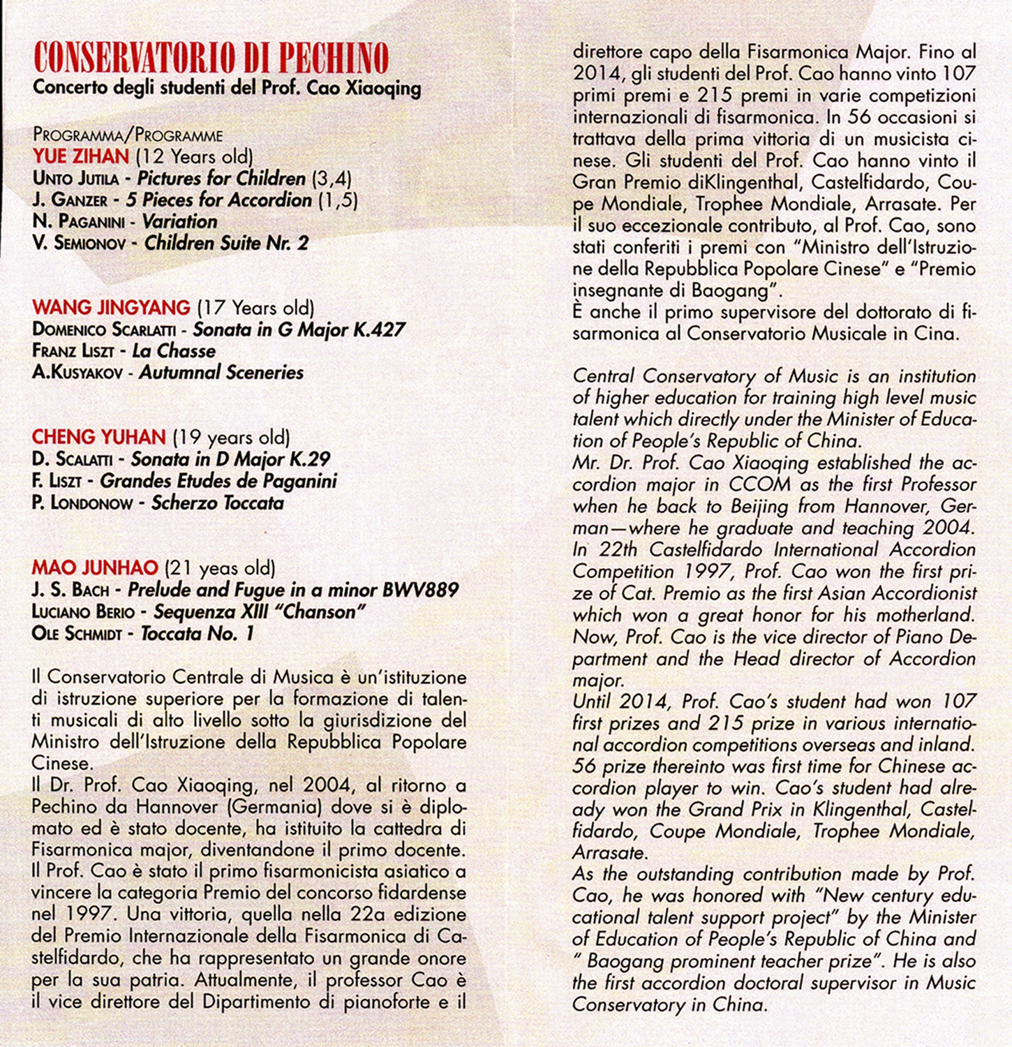 卡斯特费达多国际手风琴比赛是同德国克林根塔尔国际手风琴比赛、西班牙阿拉萨特国际手风琴比赛、莫斯科国际手风琴比赛及手风琴世界杯和手风琴世锦赛齐名的国际手风琴界最重要赛事活动, 此项手风琴国际比赛已有了42年的历史。 KY开元几位选手毛俊澔、程玉菡、王婧洋和王丹在此次比赛中高水平发挥,在不同组别中赢得了评委和各国听众的一致好评,取得了两项第一名,一项第二名和一项第三名的佳绩。 在比赛期间组委组还特意安排了题为"KY开元集团官网曹晓青教授学生专场音乐会"作为比赛期间的重要音乐会内容,在音乐会上组委会艺术总监克里斯琴·里甘耐利(Christian Riganelli)先生介绍了KY开元集团官网手风琴专业在曹晓青教授的带领下为国际手风琴舞台上带来了一次次"中国手风琴的惊喜",十几年来曹晓青教授的教学成果为意大利卡斯特费达多国际手风琴比赛增添了重要的东方色彩,在20年前(1997年)曹晓青教授作为选手成为了第一位在此项比赛中荣获第一名的中国人,克里斯琴·里甘耐利先生代表组委会向曹晓青教授和他的学生们为此赛事的发展做出的努力表示衷心地感谢,并向KY开元集团官网手风琴师生取得的成就表示热烈的祝贺!专场音乐会取得了圆满成功,得到了专家和各国听众的高度评价。