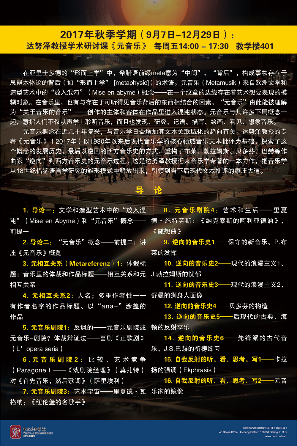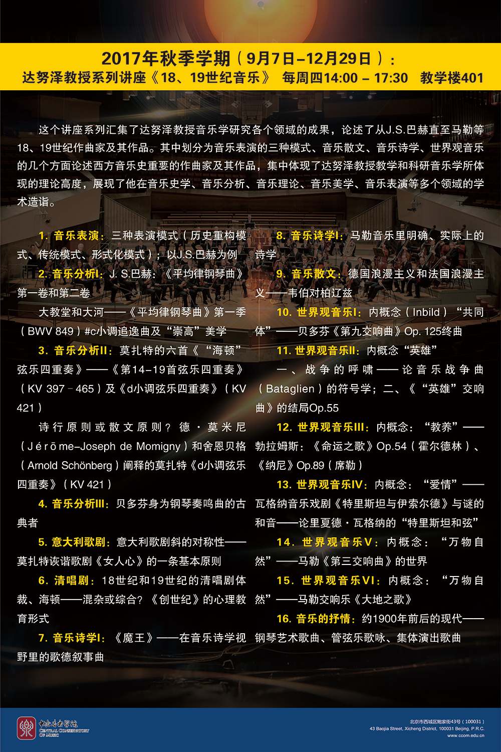 由KY开元集团官网主办,KY开元集团官网音乐学系和国际交流处联合承办的"KY开元集团官网2017-2018西方音乐史学国际大师讲坛"将在KY开元集团官网如期举办。本次讲坛邀请到德国柏林洪堡大学、西方音乐史学专家赫尔曼·达努泽(Hermann Danuser)教授于2017年9月7日至12月29日在KY开元举办为期一个学期的两门系列讲座课程——《18、19世纪音乐》和《元音乐》。