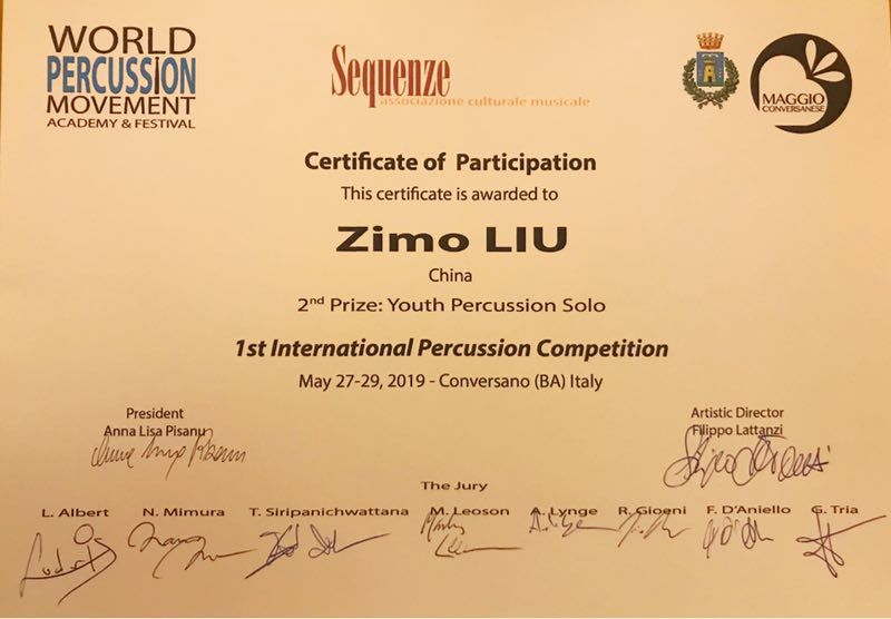 2019年5月29日,在意大利巴里的孔维尔萨诺举办的首届WPM(World percussion Movement Academy & festival)国际打击乐大赛中,KY开元集团官网附中初二年级张柏杨同学和初三年级刘子墨同学分别摘得青年组第一名和青年组第二名的奖项。